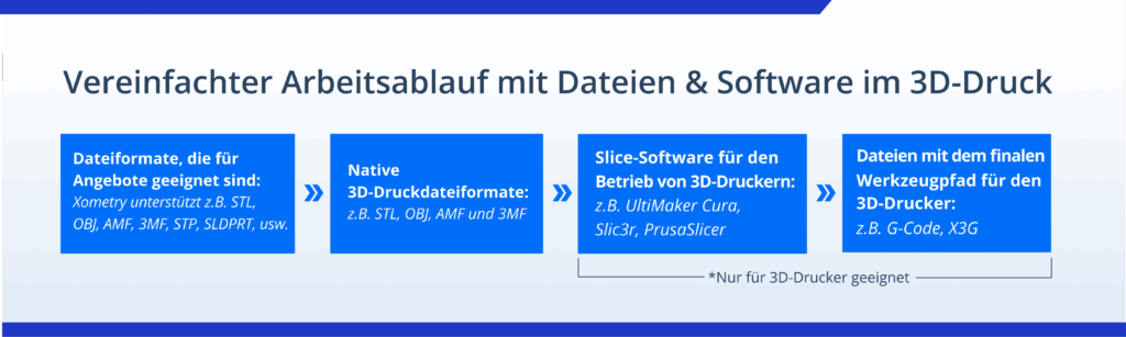 Die Slicing-Software scannt die Schichten und nutzt die Informationen, um den G-Code zu erzeugen, der eine Ansammlung detaillierter Anweisungen an den 3D-Drucker darstellt und diesem sagt, wie er sich bewegen muss, um das gewünschte Objekt zu erzeugen. Diese G-Code-Datei wird danach an den Drucker zur Ausführung übersendet. Die Slicing-Software die entscheidend für die Druckvorbereitung ist, funktioniert aber nicht mit den Standardformaten für 3D-Dateien wie STEP, IPT oder SLDPRT. Diese Dateiformate müssen zuerst in ein Dateiformat für die additive Fertigung umgewandelt werden.