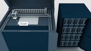 Der Düsenkopf besitzt mehrere Düsen, durch die das lichthärtende Kunstharz auf die Bauplattform gespritzt wird. Die verschiedenen Düsen können mit unterschiedlichen Materialien und mit Materialien unterschiedlicher Farbe ausgestattet werden. Der Ablauf des PolyJet 3D-Drucks lässt sich grob in fünf Schritte unterteilen: