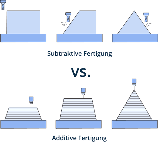 - FDM und SLA erfordern zu opfernde Stützstrukturen bei Überhängen größer 45°.