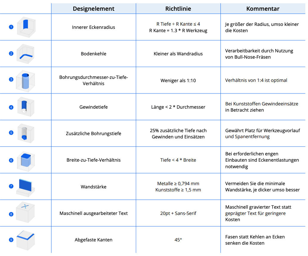Die folgende Tabelle fasst die Konstruktionsrichtlinien zusammen, die mit verschiedenen Merkmalen verbunden sind, die im CNC erzeugt werden können. Ihr Zweck soll es sein, Konstrukteuren dabei zu helfen, die Komponenten hinsichtlich ihrer Herstellbarkeit zu optimieren.