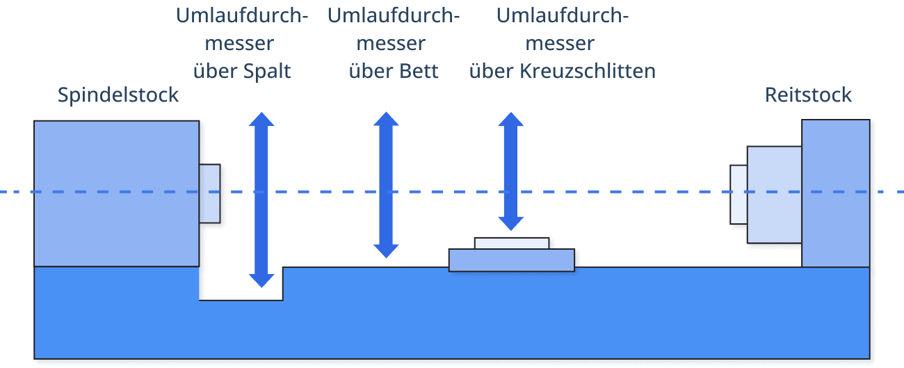 Der „Umlaufdurchmesser über Kreuzschlitten“ ist der erlaubte Durchmesser oberhalb des Kreuzschlittens, der immer kleiner ist als der Umlaufdurchmesser über Bett. Der „Umlaufdurchmesser über Spalt“ zeigt eine kleine Lücke an, die einen Abschnitt des Werkstücks mit einem größeren Durchmesser erlaubt, wie er zum Beispiel für die maschinelle Erzeugung von Flanschen notwendig ist.