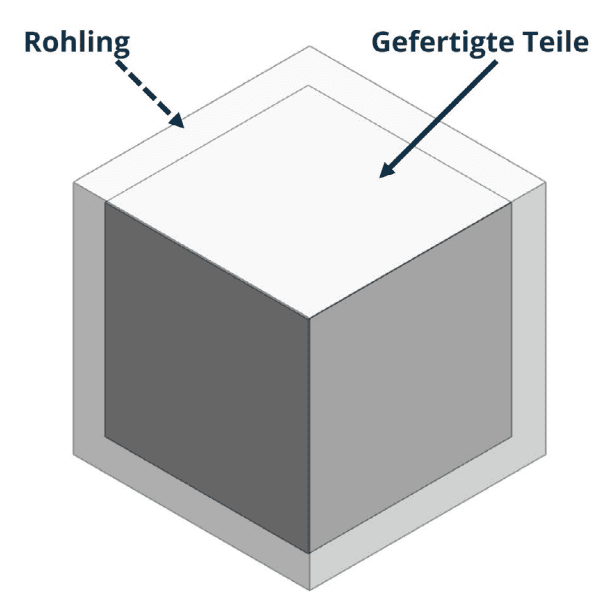 Dies bezieht sich auf die Größe des Rohmaterials, das für die Herstellung der fertigen Komponente verwendet wird. Rohlinge sind in der Regel etwas größer als das fertige Teil, damit sowohl Schwankungen in der Rohlingsgröße kompensiert als auch die eher rauen Oberflächen des Rohmaterials glatt geschnitten werden können.