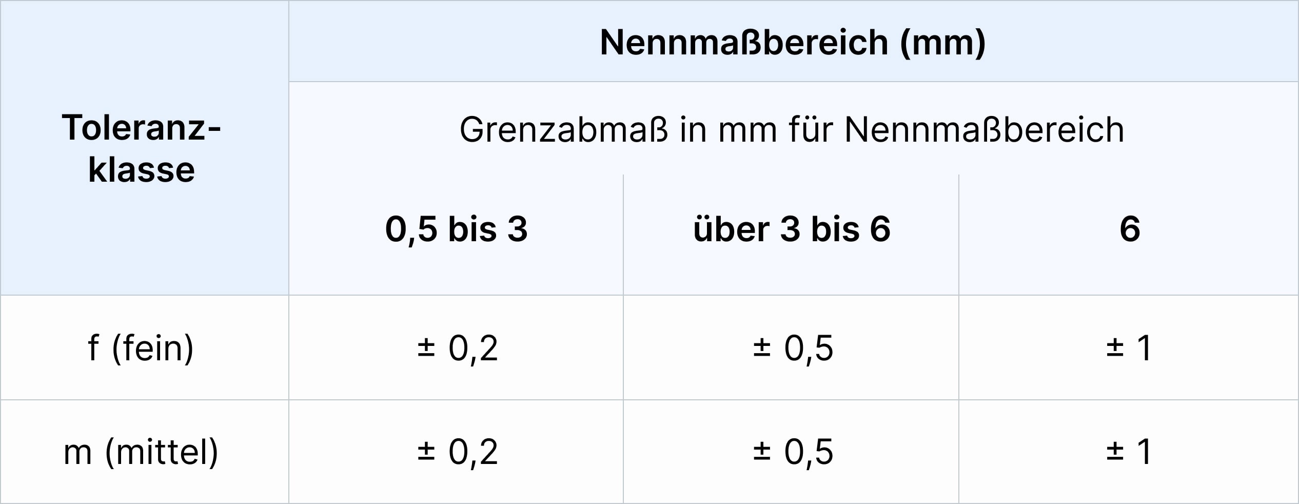 Die folgende Tabelle führt die in ISO 2768 definierten Toleranzgrenzen für lineare Abmessungen in verschiedenen Nenngrößenbereichen auf, die in feine (f) und mittlere (m) Toleranzklassen unterteilt sind.
