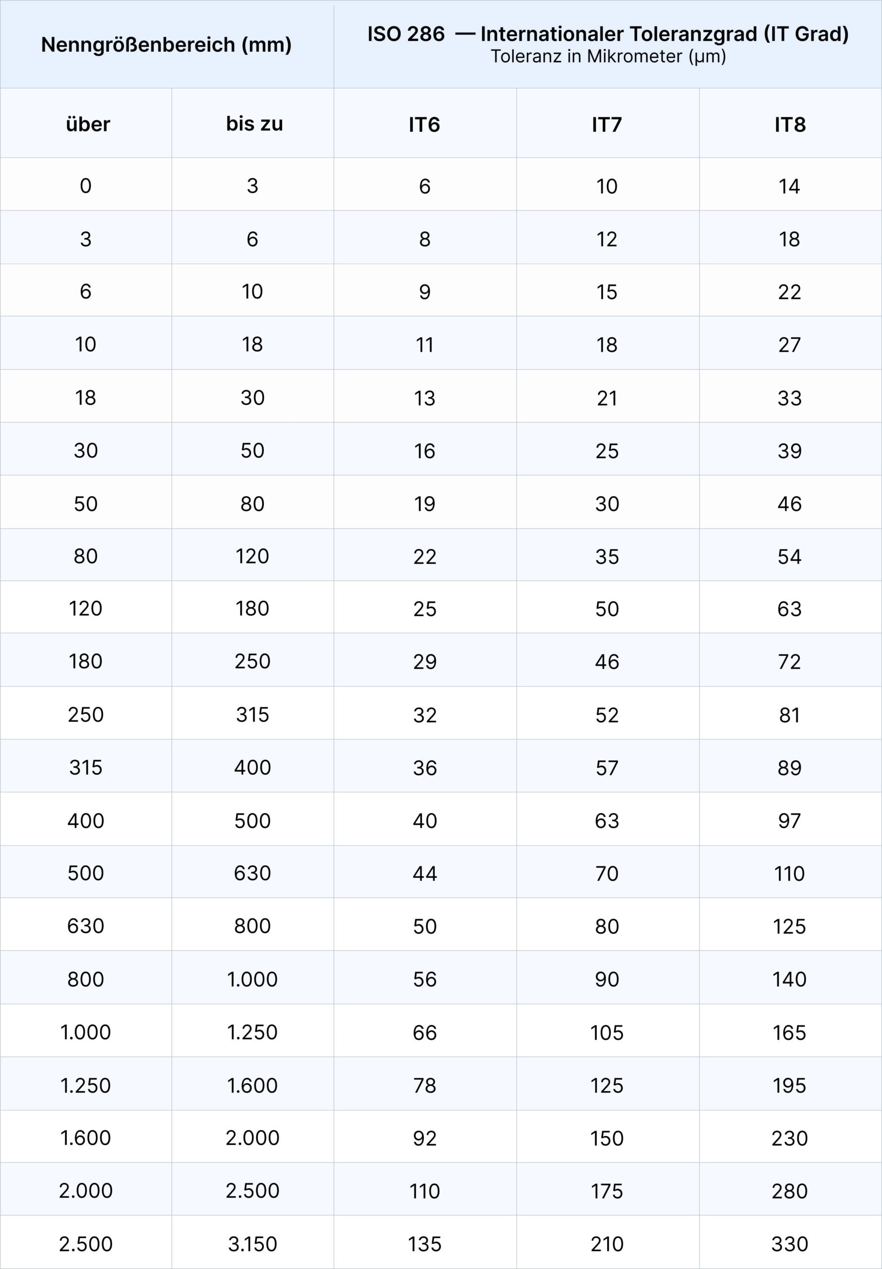 Die folgende Tabelle enthält die Toleranzgrenzen nach ISO 286 für lineare Abmessungen auf Grundlage verschiedener Nennmaßbereiche, in Mikrometern (µm) angegeben für drei Gütegrade: IT6, IT7, IT8.