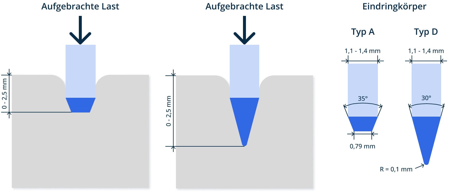| Art d. Eindringkörpers | Konische Spitze für weichere Materialien | Schärfere Spitze für das Eindringen in härtere Materialien |