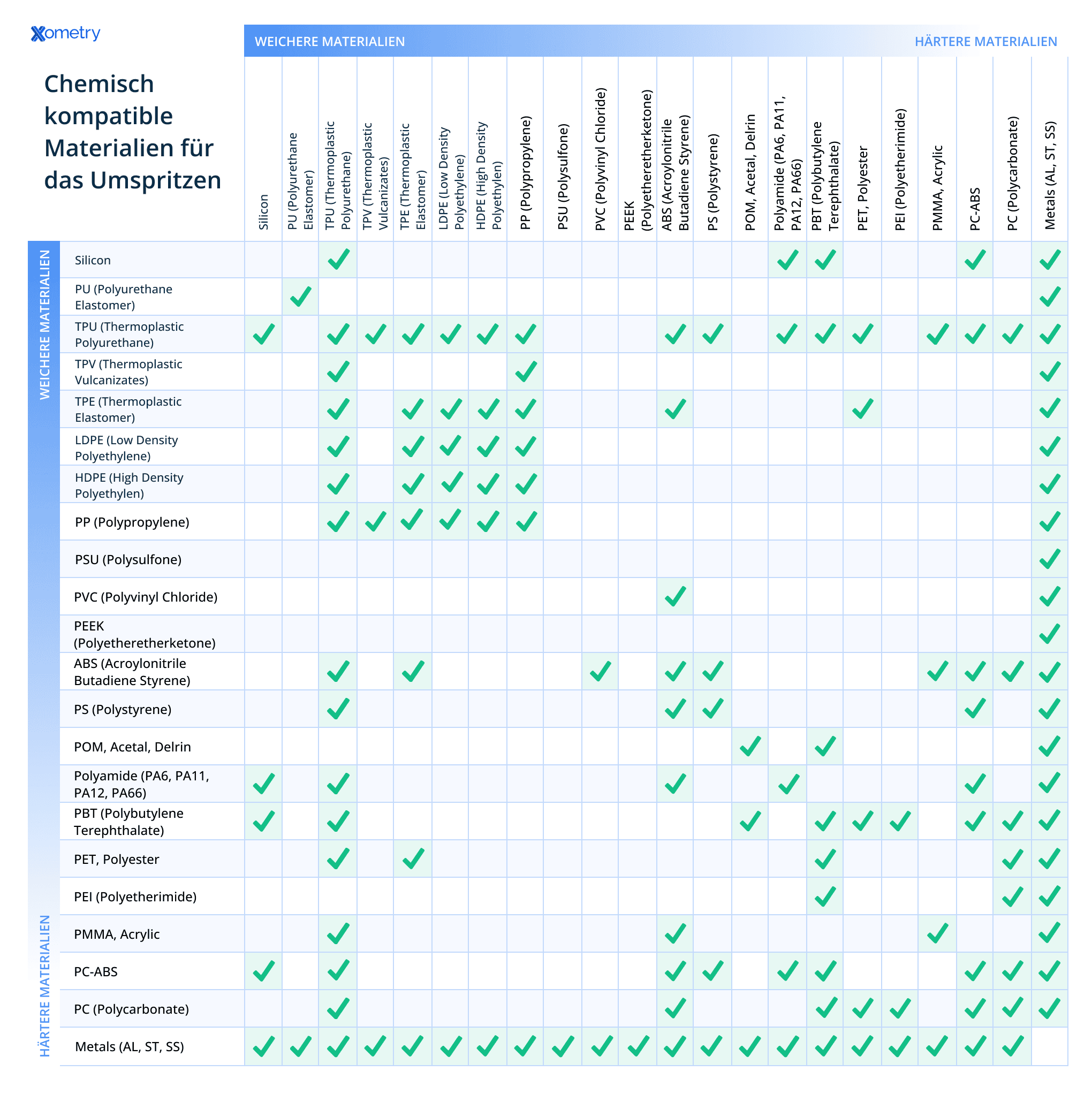 Die chemische Kompatibilität beim Umspritzen ist und bleibt unerlässlich für das Erreichen einer starken, haltbaren Verbindung der Materialien, die dadurch die Verlässlichkeit des Produkts, seinen Widerstand gegen Belastungen und die langfristige Leistung beeinflussen. Die folgende Tabelle zeigt einen umfassenden Überblick über die Kompatibilität von Materialien für das Umspritzverfahren, und zeigt, wie verschiedene weichere Materialien sich effektiv mit härteren Substanzen verbinden können.