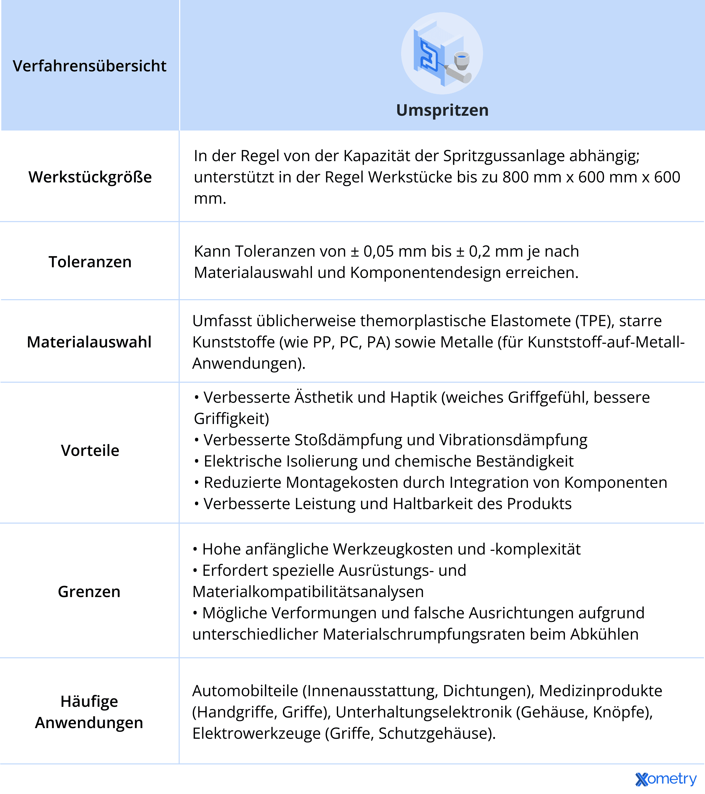 Die folgende Tabelle bietet einen kurzen Überblick über die wichtigsten technischen Details, Materialien und Vorteile des Umspritzens.