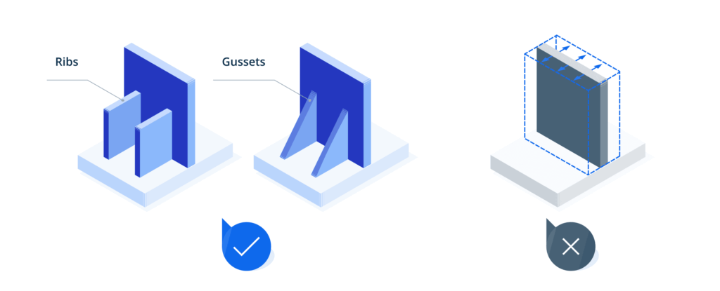 Rippen können insbesondere bei großen flachen Bereichen hinzugefügt werden, um diese zu verstärken und Verformungen zu vermeiden. Die Dicke der Rippen sollte geringer als die angrenzenden Wandstärken sein, um Schrumpfung und Einsinken zu vermeiden. Experten empfehlen, dass die Rippendicke nicht mehr als 60 % der nominalen Wandstärke betragen sollte, und dass die Höhe der Rippen nicht größer als das Dreifache ihrer Dicke ist.