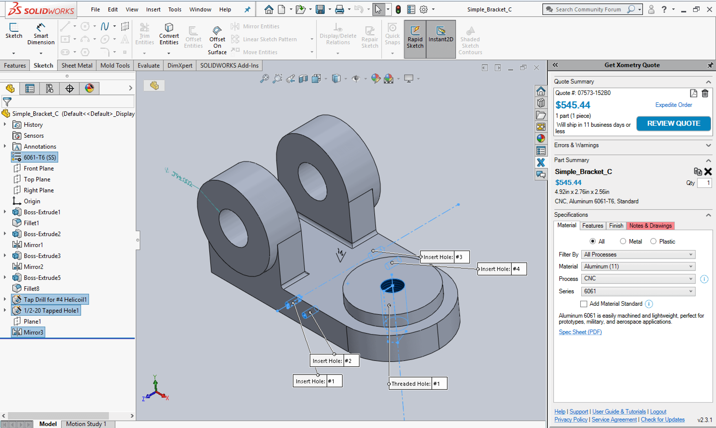 3D model in SOLIDWORKS with the Xometry add-in to get instant quotes