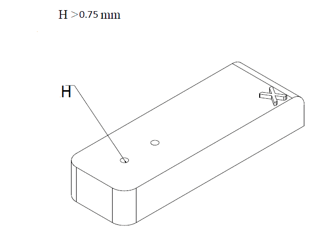 To ensure that holes do not seal off during printing, design them with a minimum diameter of 0.75 mm. For holes longer than 12 mm. The minimum diameter can be slightly increased.