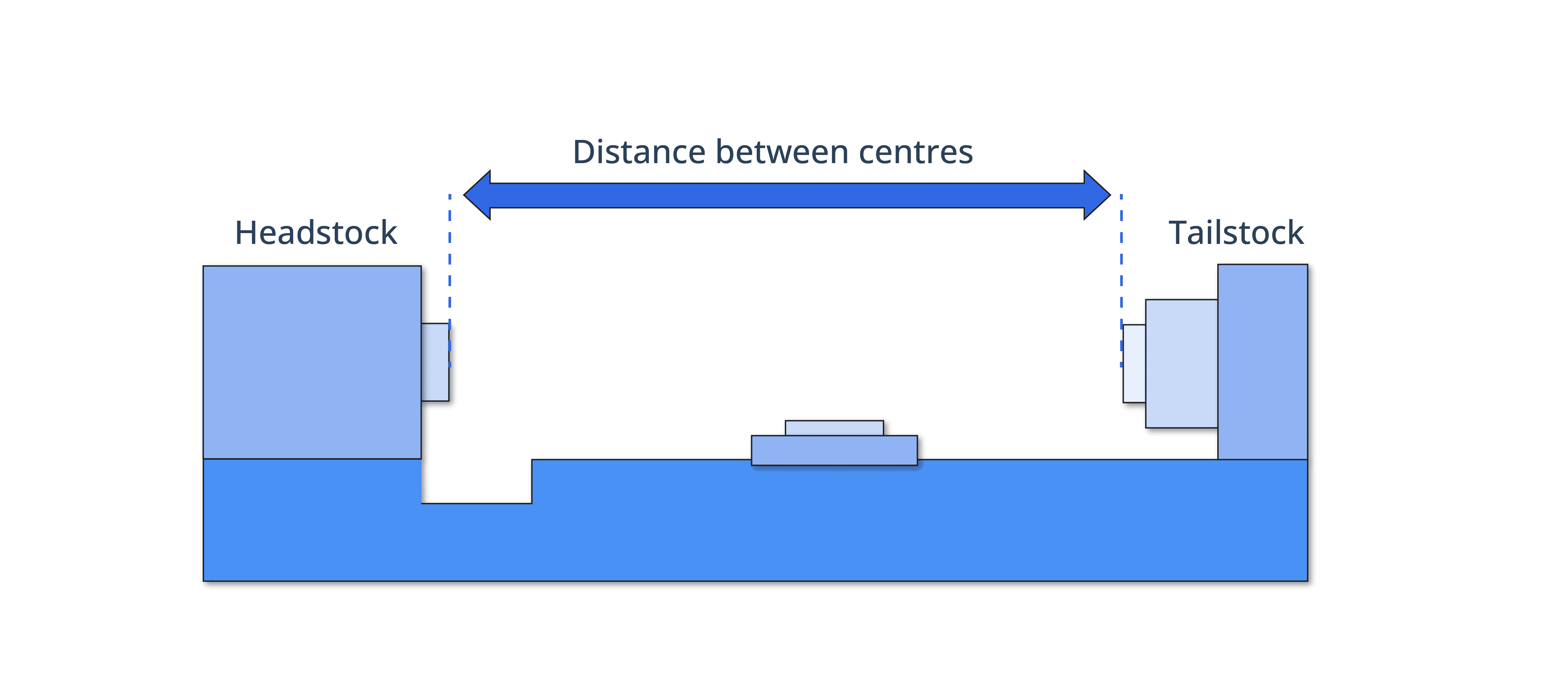 For a CNC Lathe, the distance between centres refers to the distance between the lathe headstock and tailstock. This limits the total maximum machinable length of the component that can be machined.