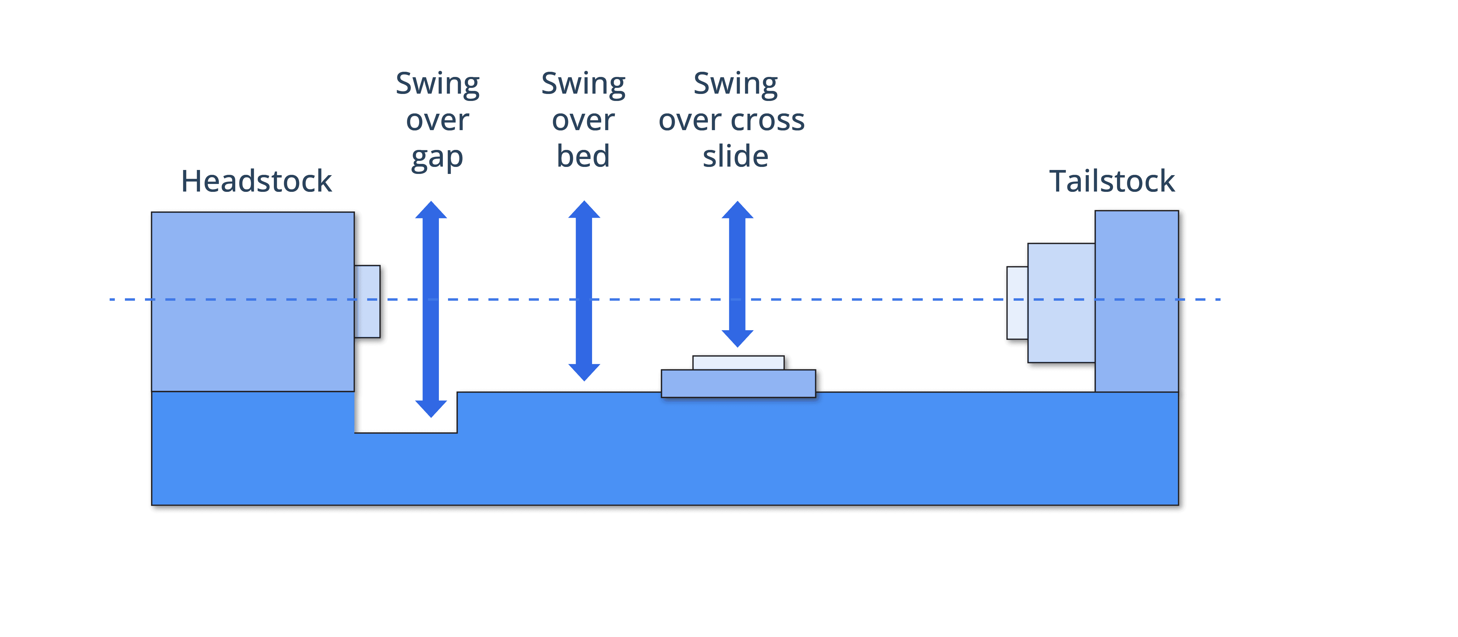 The terms “Swing Over Bed,” “Swing Over Cross Slide,” and “Swing Over Gap” define different clearance measurements on a lathe. Swing Over Bed indicates the maximum diameter that can be machined over the bed’s longitudinal guideway.