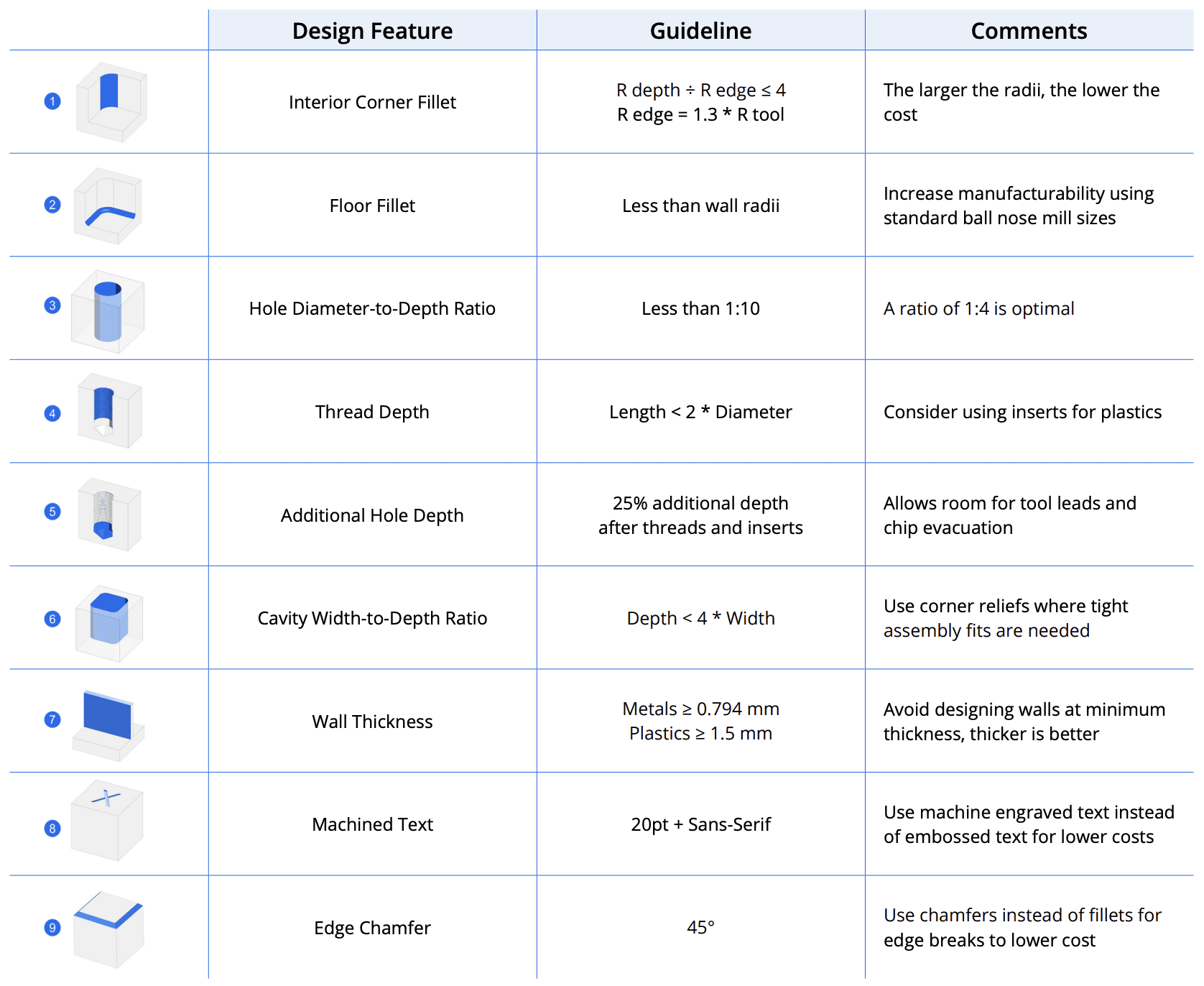 The following chart summarises the design guidelines associated with various features that can be made using CNC. Its purpose is to help designers optimise components for manufacturability.