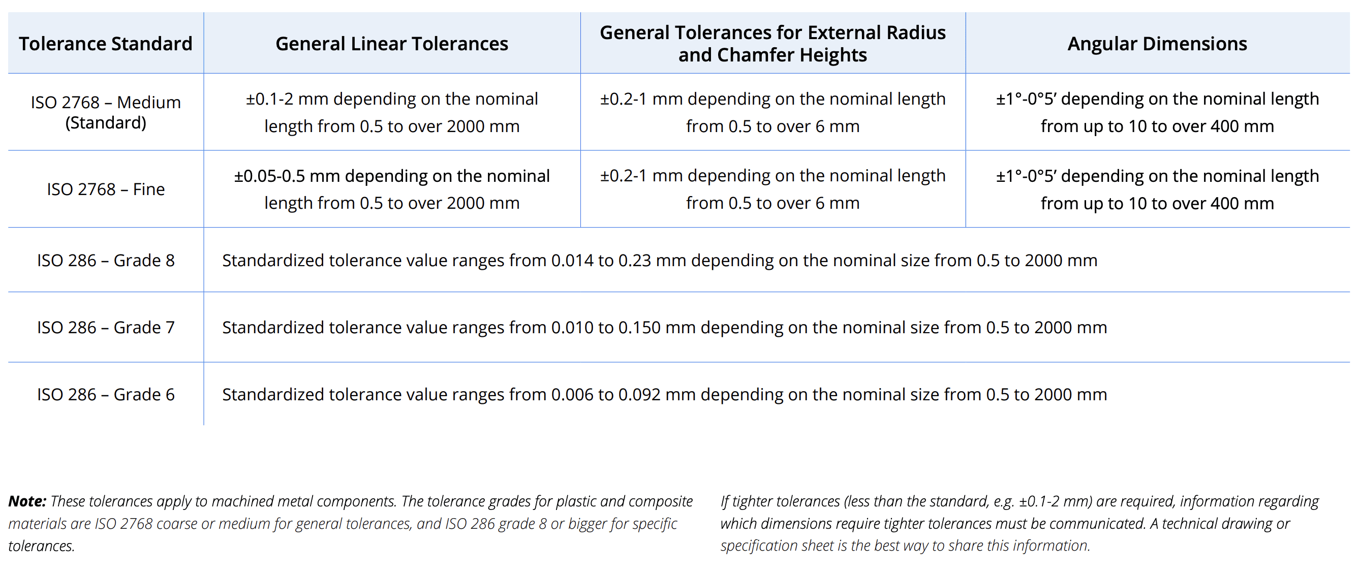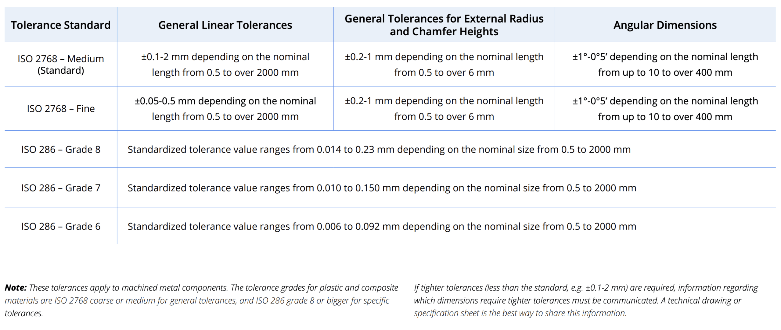 Unless specifically specified by the designer, Xometry will adhere to the industry standard ISO 2768 and ISO 286 tolerances listed below: