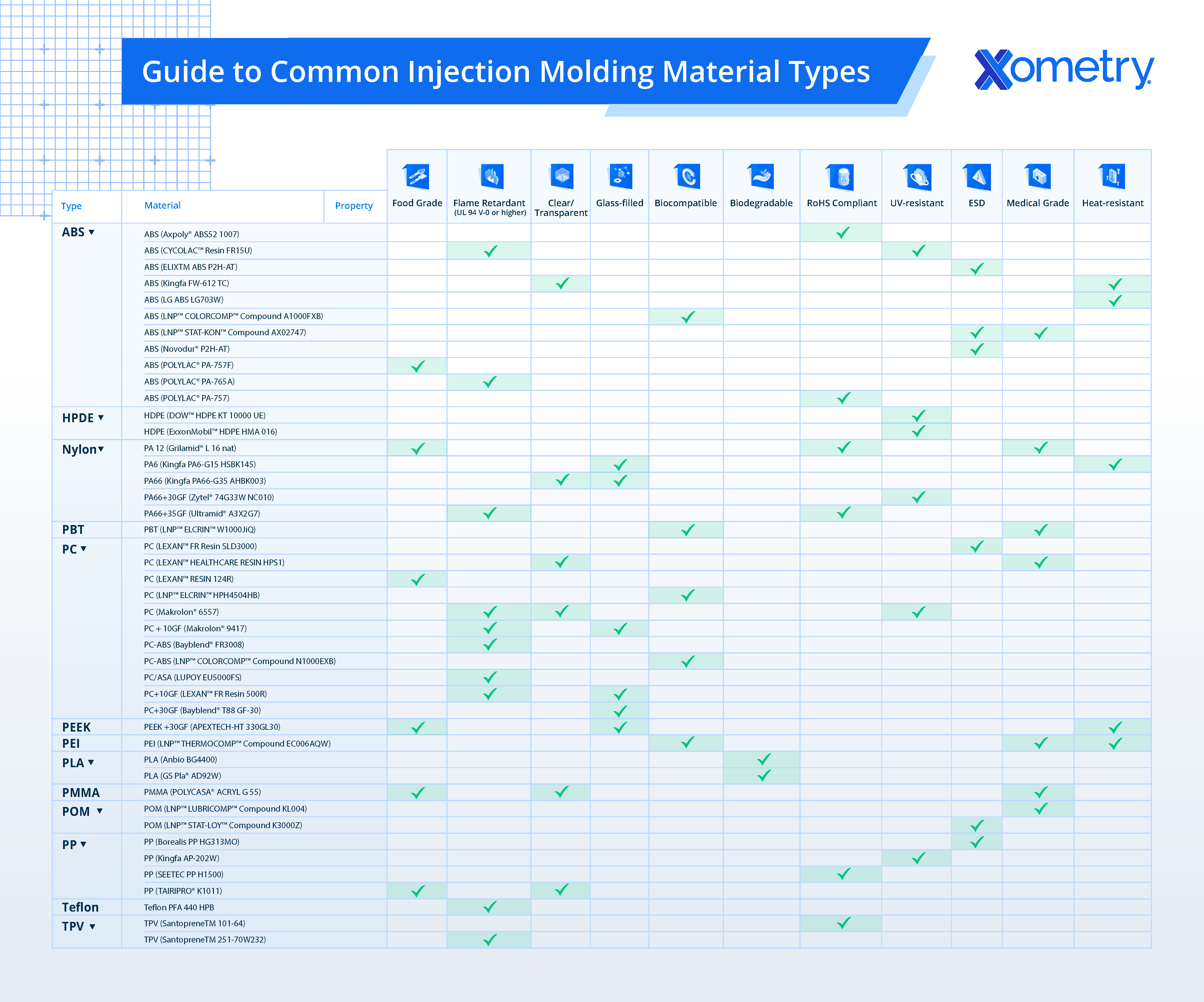 To help you cut through the clutter, we’ve organized materials by key properties—heat resistance, food safety, UV stability, and more—into one clear, easy-to-read guide. Think of it as your go-to cheat sheet for material selection, saving you time and hassle as you plan your next project.