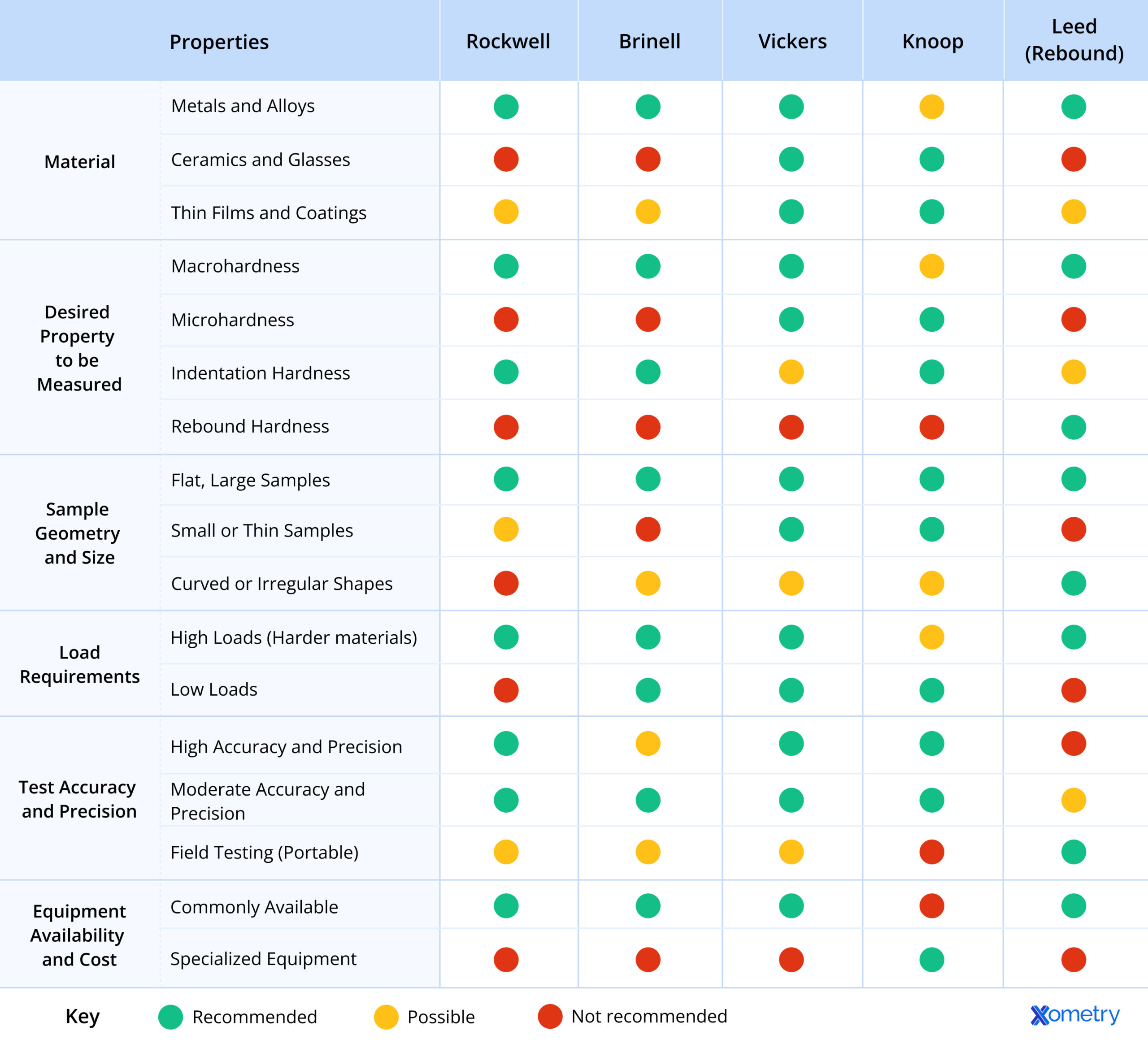 Below is a quick reference chart comparing the different hardness test methods in terms of suitable materials, advantages and disadvantages, applications, load range, indentation type and applicable standards.