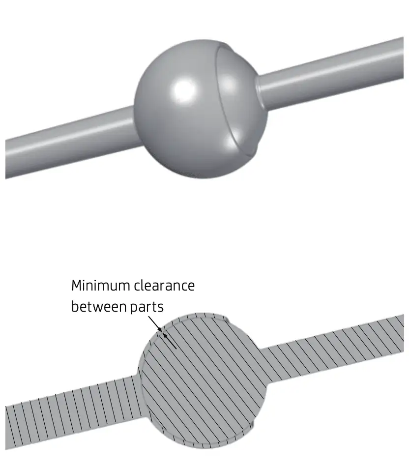 For parts that are to be assembled after printing, a minimum clearance of 0.4 mm is required; 0.2 mm for each of the mating parts.