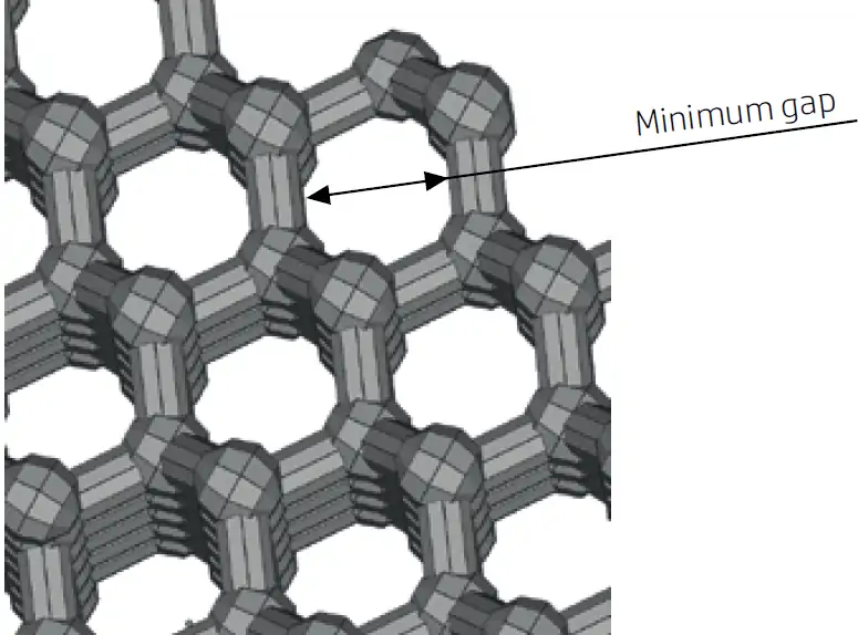 The recommended minimum gap size in a lattice structure is 1 mm. This is to enable the removal of residual material inside the part.