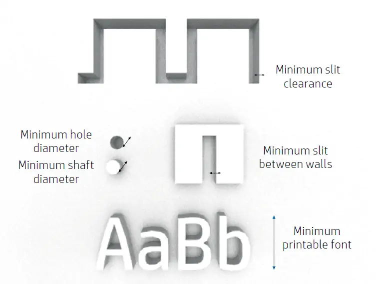 MJF is capable of printing really small parts but there is a limit. The minimum printable sizes for different features in the X, Y, and Z planes are as follows: