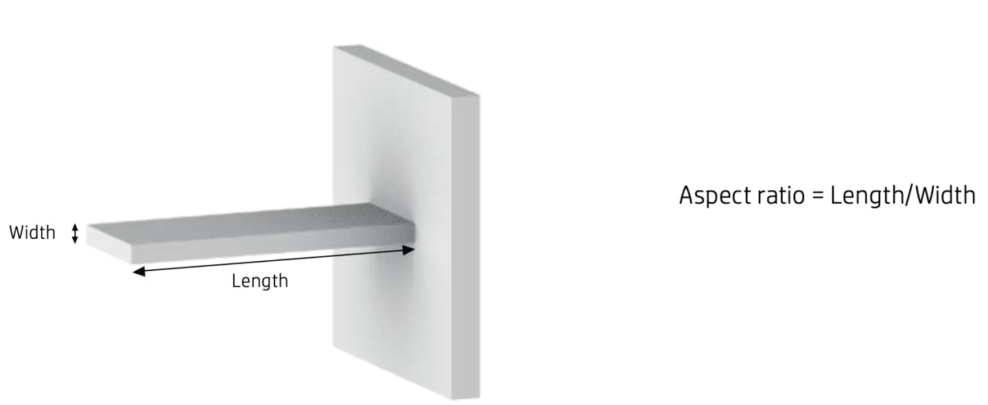 The minimum wall thickness for a cantilever depends on its aspect ratio, which is the ratio of its length to its width. For cantilevers that are less than 1 mm wide, the aspect ratio should be less than one.