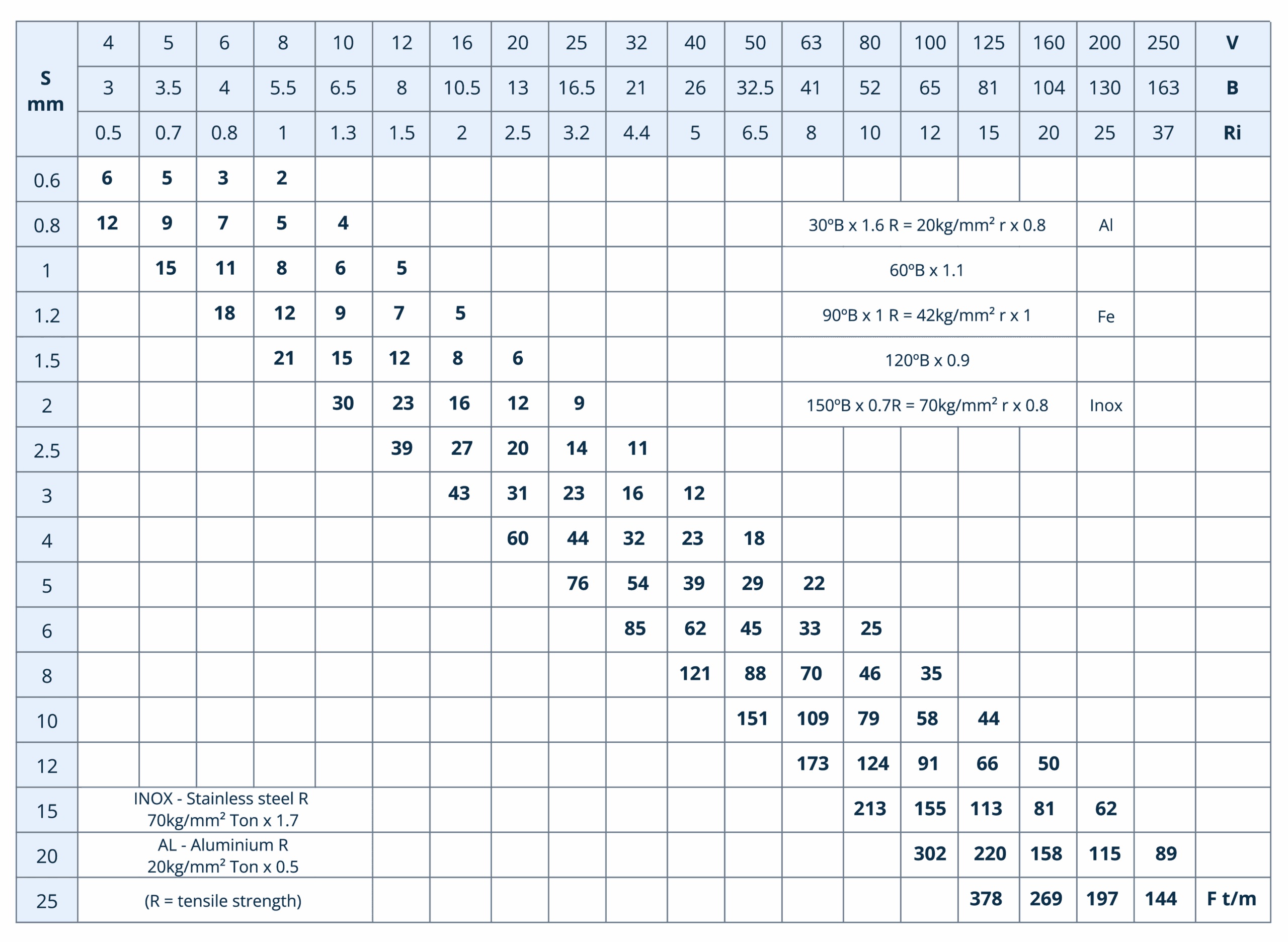 The chart below can be used to calculate the bending force required to V bend mild steel S235 of different thicknesses, in different shapes, at an angle of 90°. Mild steel S235 has a bending strength of 42 kg/mm². The variable parameters are as follows.