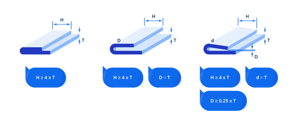 For tear drop hems, the diameter should also be equal to the sheet thickness. The hem opening (spacing between the hem edge and the part) should be at least ¼ of the sheet metal thickness.