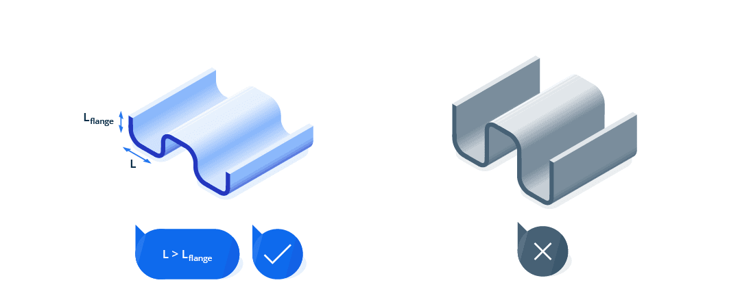 Flanges are the edge of the part that is bent from the stationary base. It should be at least 4 times the sheet thickness. If you make a flange with chamfered ends, these chamfers have to leave enough room to achieve proper bends.