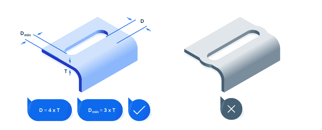 Slots require more clearance. Place them at least 4 times the material’s thickness from the bend edges.