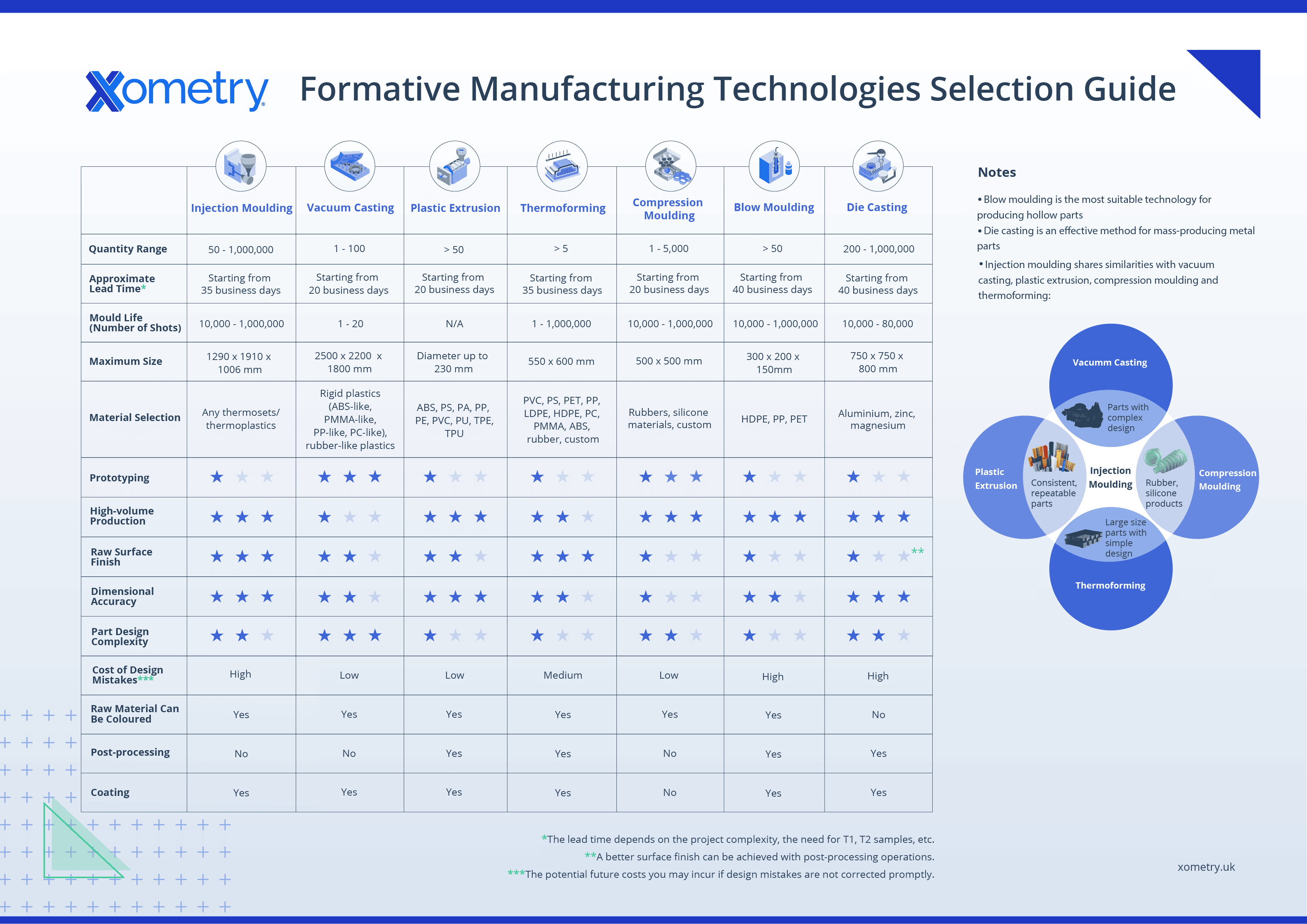 Formative manufacturing technologies are crucial for producing parts with precision, efficiency, and scalability. Our infographic, created with insights from our lead injection moulding engineer, provides a comprehensive overview of seven major technologies (injection moulding, vacuum casting, plastic extrusion, thermoforming, compression moulding, blow moulding, and die casting) according to key factors.
