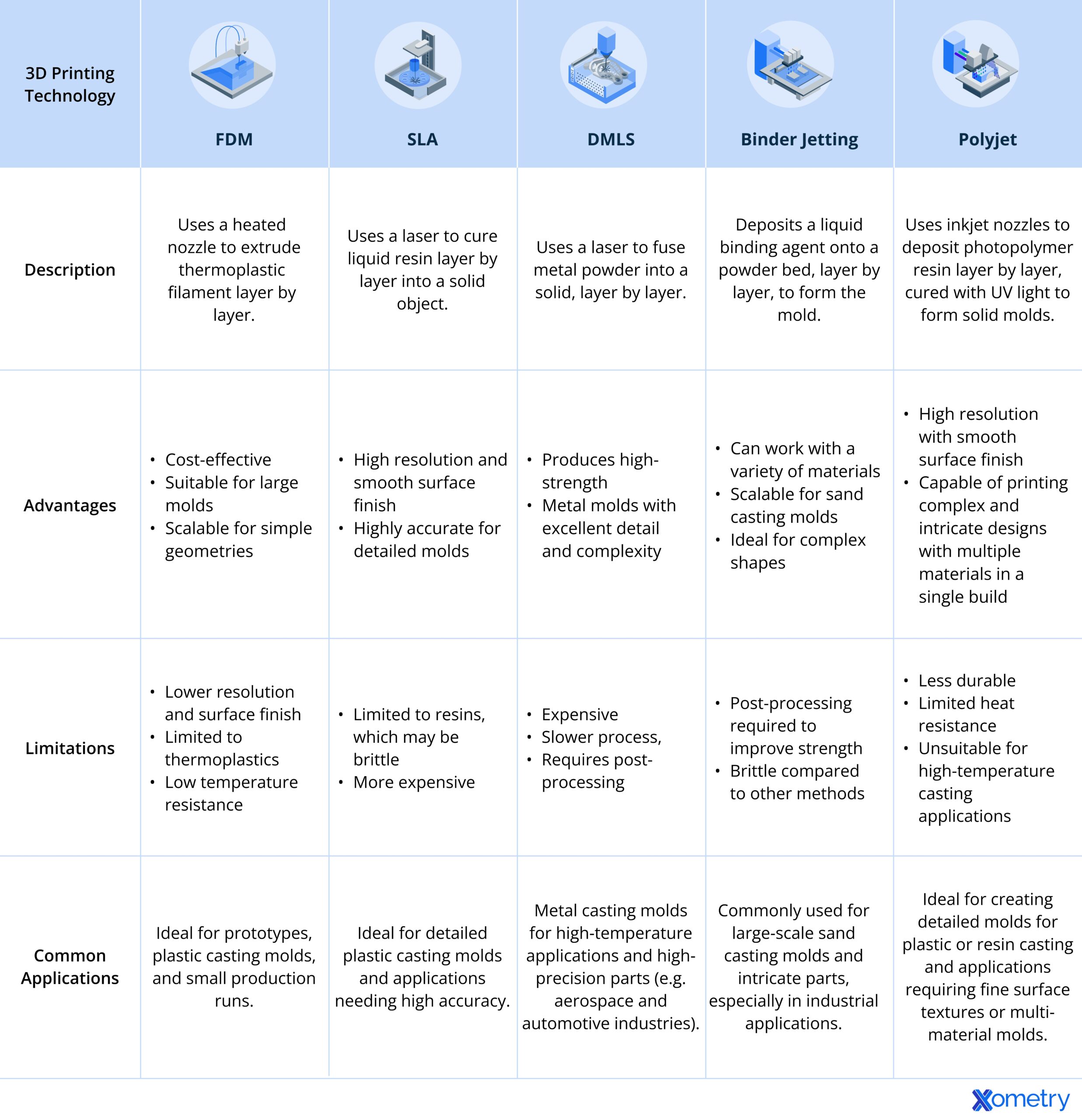 Various 3D printing technologies can be employed to create molds for casting. The choice of technology often depends on factors such as the casting material, mold complexity, and desired surface finish. The 5 most commonly used 3D printing technologies for mold-making offer unique benefits in terms of cost, resolution, and suitability for different materials:
