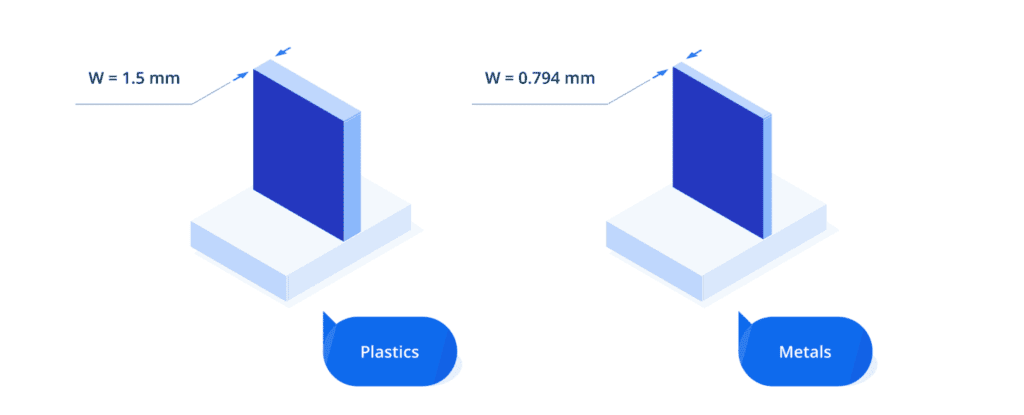 - Set a minimum wall thickness of 0.8 mm for metals and 1.5 mm for plastics to avoid deflection.