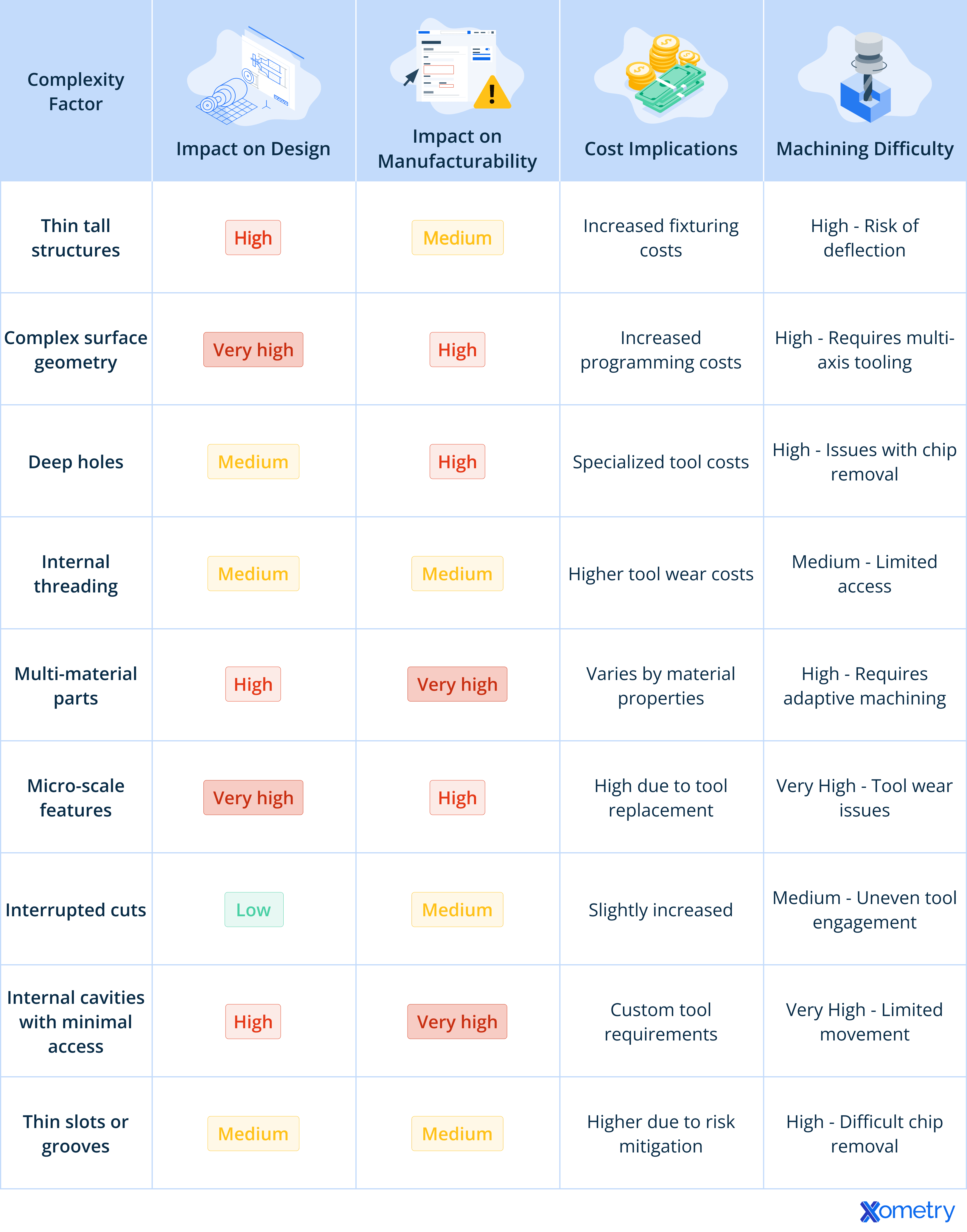 Complex CNC machined parts feature intricate geometries, tight tolerances, multi-material compositions, and sometimes large sizes, often demanding multi-axis machining and advanced processes. The table below provides an overview of key complexity factors in CNC machining, outlining their impact on design, manufacturability, costs, and overall machining difficulty.
