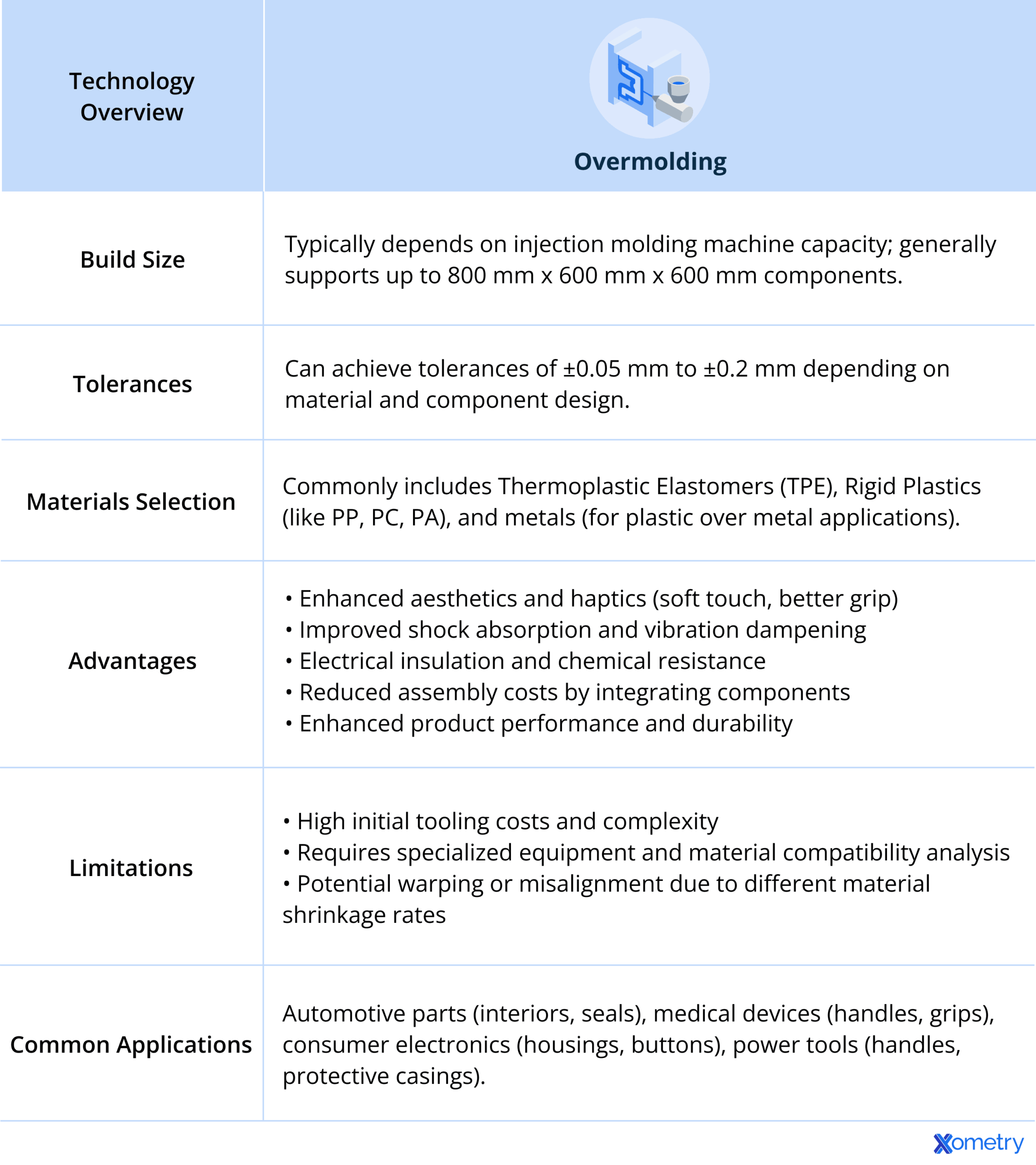 The table below provides a concise overview of the key technical details, materials, and benefits of overmolding.