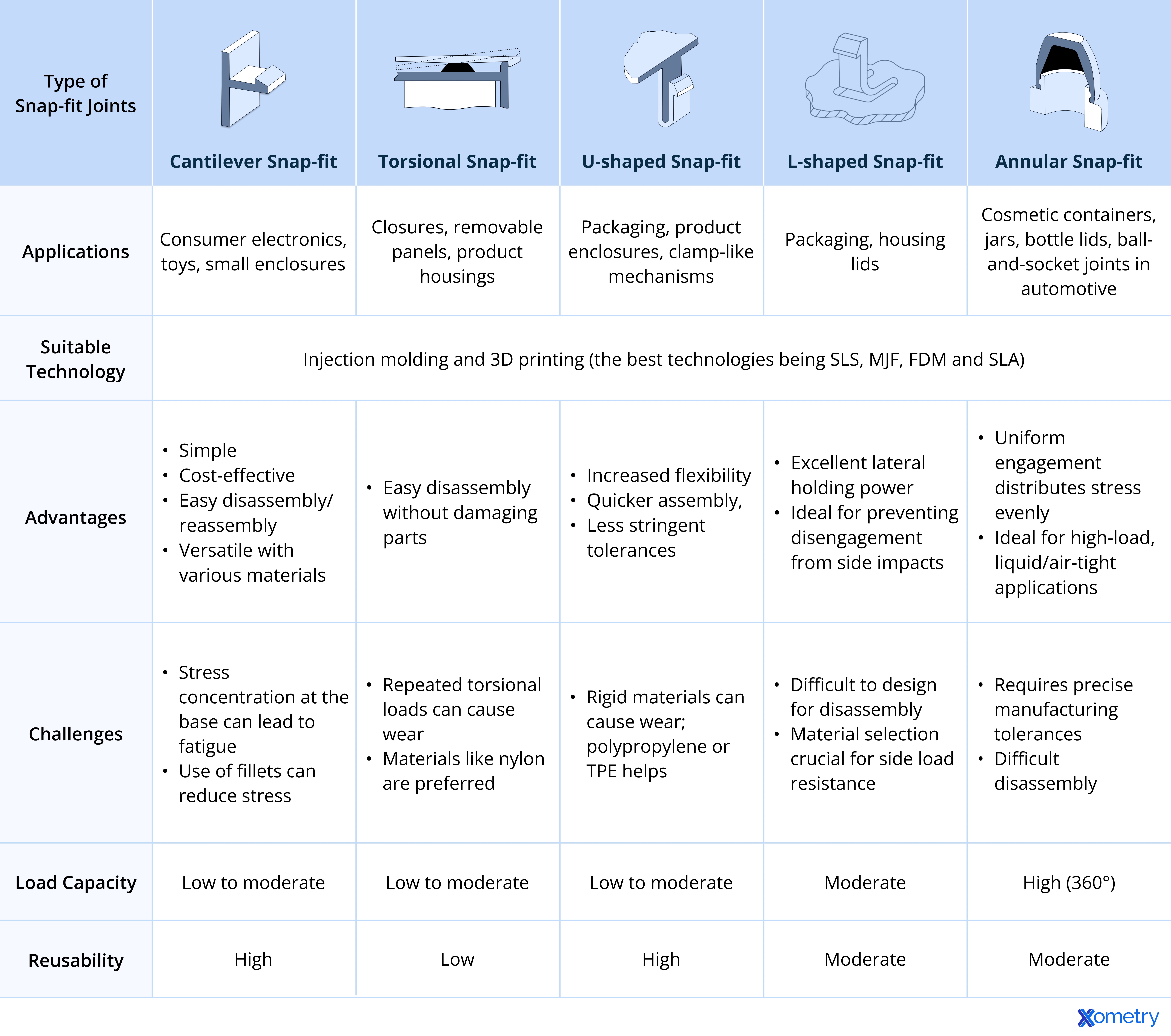 The table below highlights the key aspects of each snap-fit joint (applicable to 3D printing and injection molding processes) for easy reference: