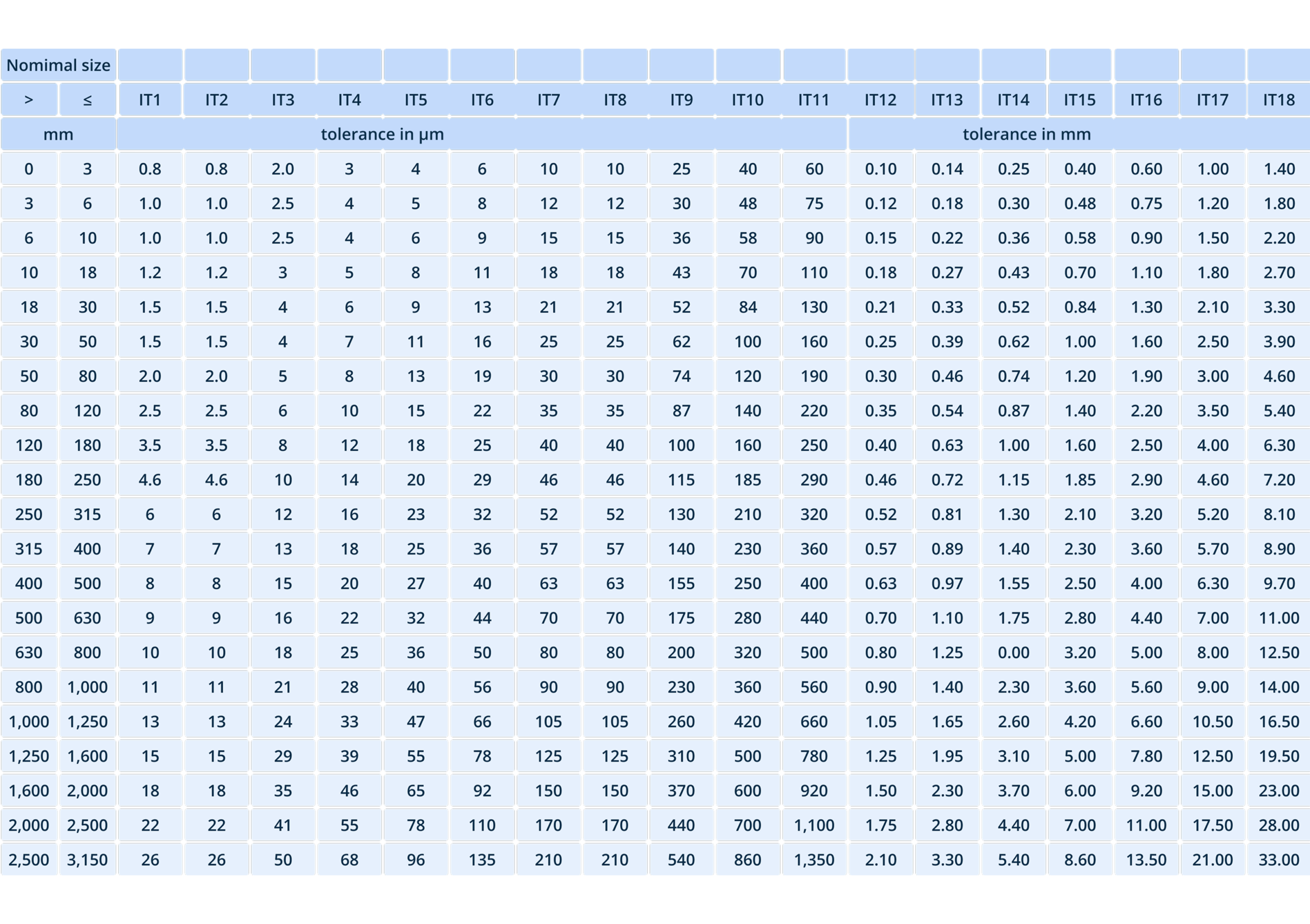 IT grades determine the precision level and manufacturing cost. Lower numbers represent tighter tolerances. Use the table below as a guide for selecting the correct grade for your application: