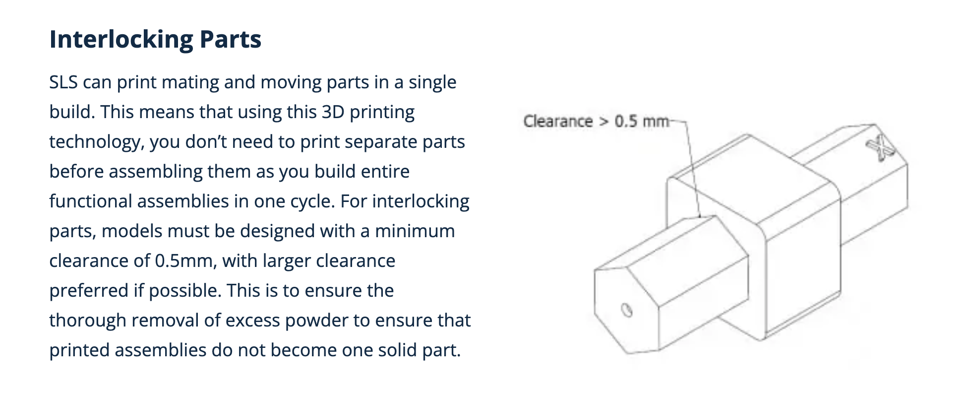 To create two parts articulated by an axis that’s fixed on one of the parts, what should be done? Is it possible to print both parts in the same file that will remain timeless? Which printing technology should be used? What allowance should be left to allow one part to pivot around the other, and is it possible with nylon 12?
