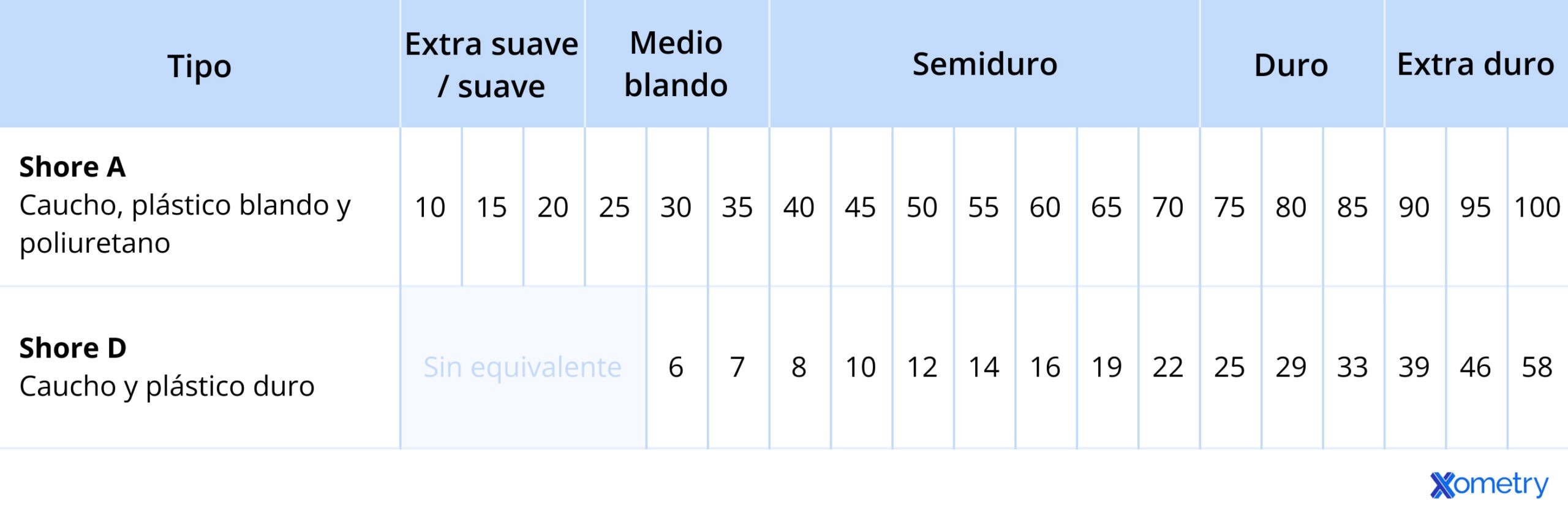 La tabla siguiente muestra los valores aproximadamente equivalentes para las escalas Shore A y Shore D: