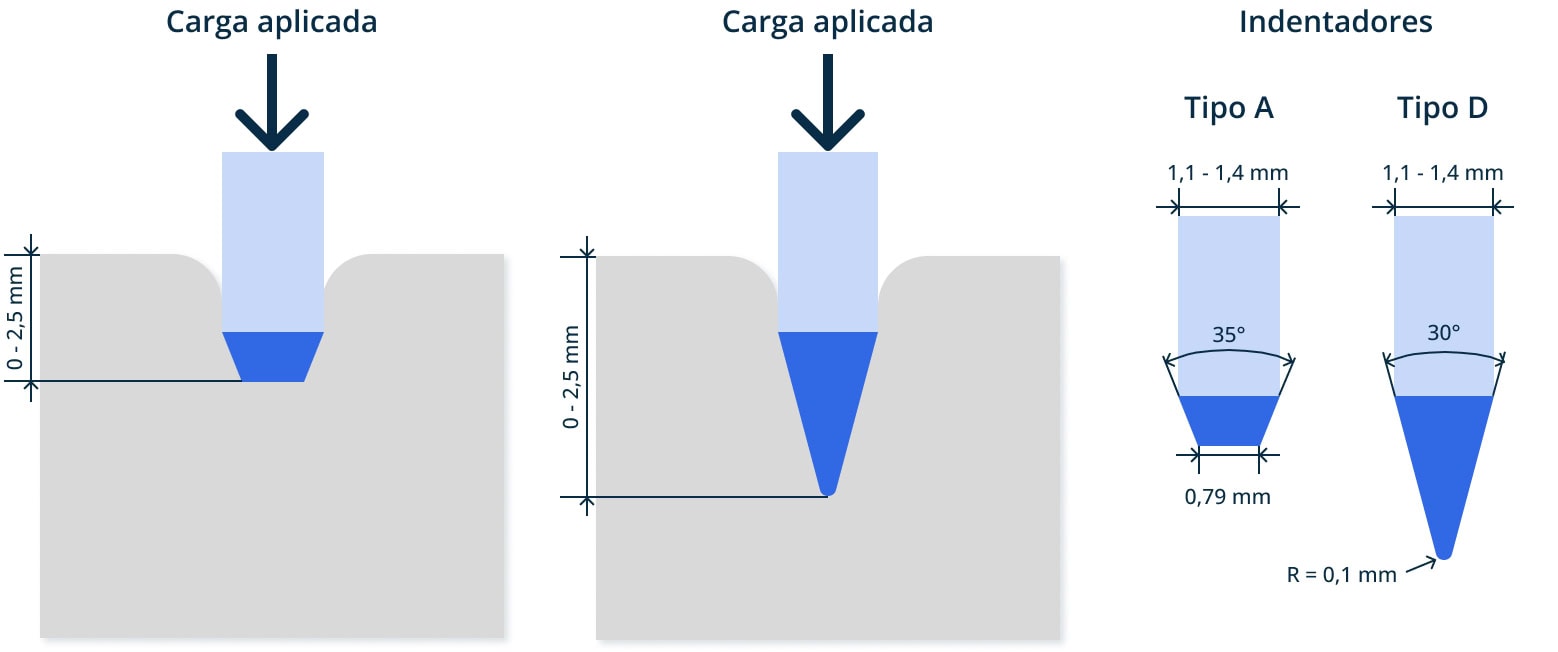 Las principales diferencias entre las escalas Shore A y Shore D residen en el tipo de indentador y la fuerza aplicada para realizar los ensayos, así como en los materiales que se pretende medir. Estas diferencias son cruciales para seleccionar el procedimiento y la escala de ensayo del durómetro Shore adecuados.