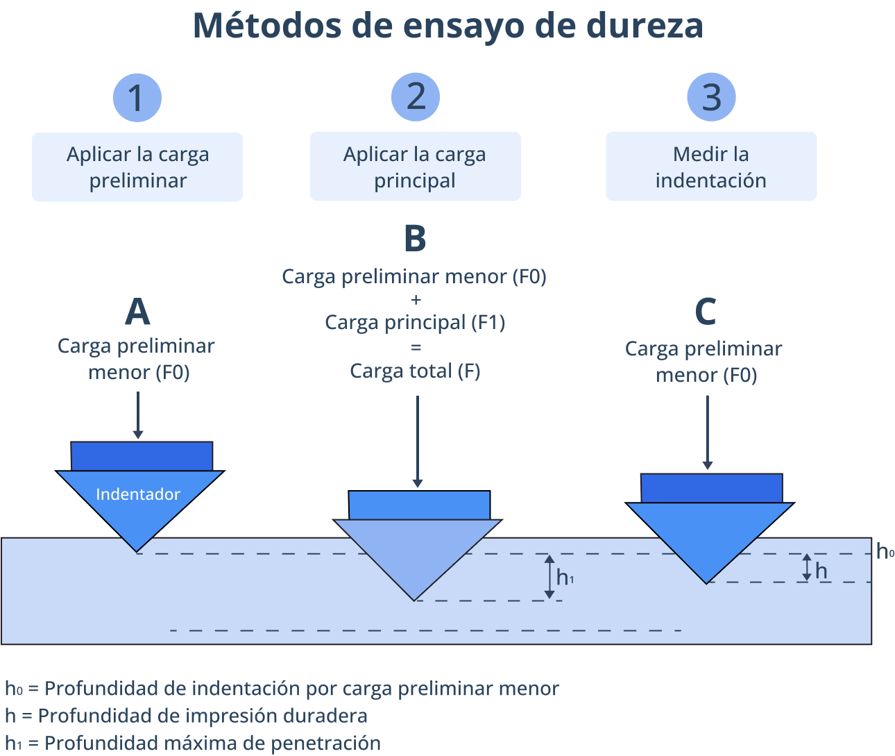 El ensayo de dureza Rockwell consiste en aplicar una secuencia de cargas al material y medir la profundidad de la hendidura resultante, que indica la dureza del material. Aquí tiene una descripción del proceso paso a paso :