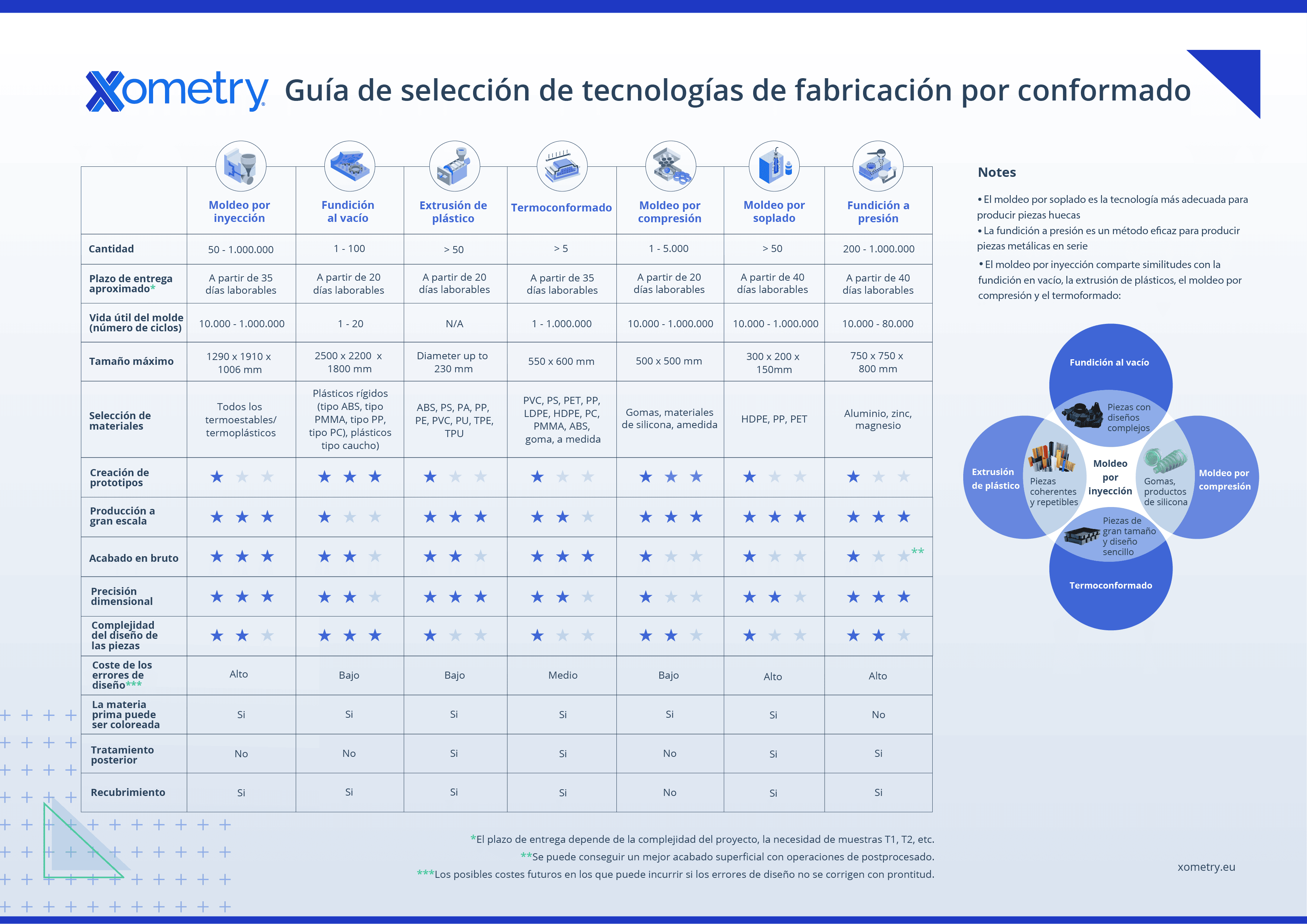 Las tecnologías de fabricación por conformado son cruciales para producir piezas con precisión, eficiencia y escalabilidad. Nuestra infografía, creada con las aportaciones de nuestro ingeniero jefe de moldeo por inyección, ofrece una visión general de las siete tecnologías principales (moldeo por inyección, fundición en vacío, extrusión de plástico, termoconformado, moldeo por compresión, moldeo por soplado y fundición a presión) en función de factores clave.