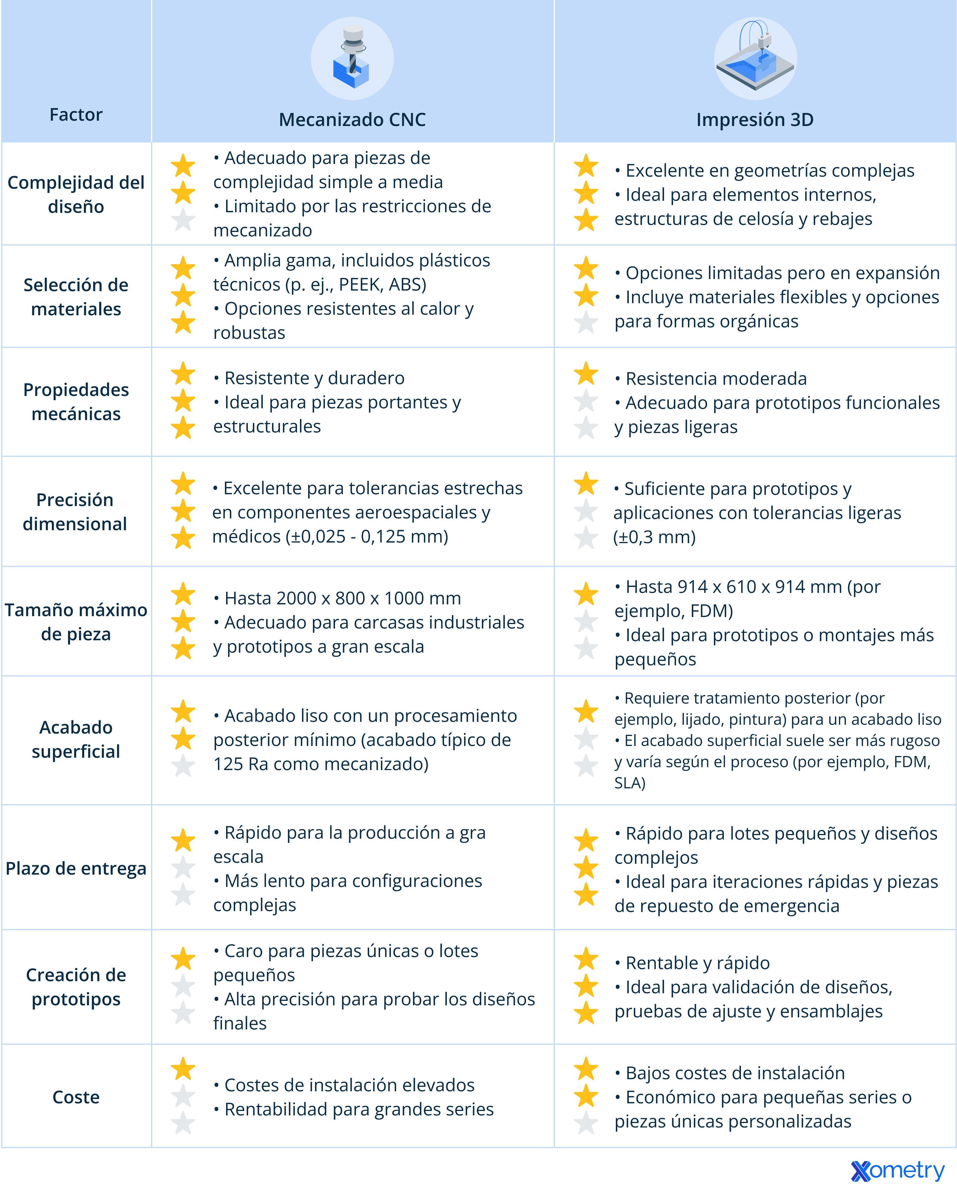 Utilice esta lista de comprobación de referencia rápida para evaluar qué proceso de fabricación se adapta mejor a las necesidades de su proyecto. Para cada pregunta, averigüe si el mecanizado CNC, la impresión 3D (3DP) o ambos ofrecen la mejor solución.