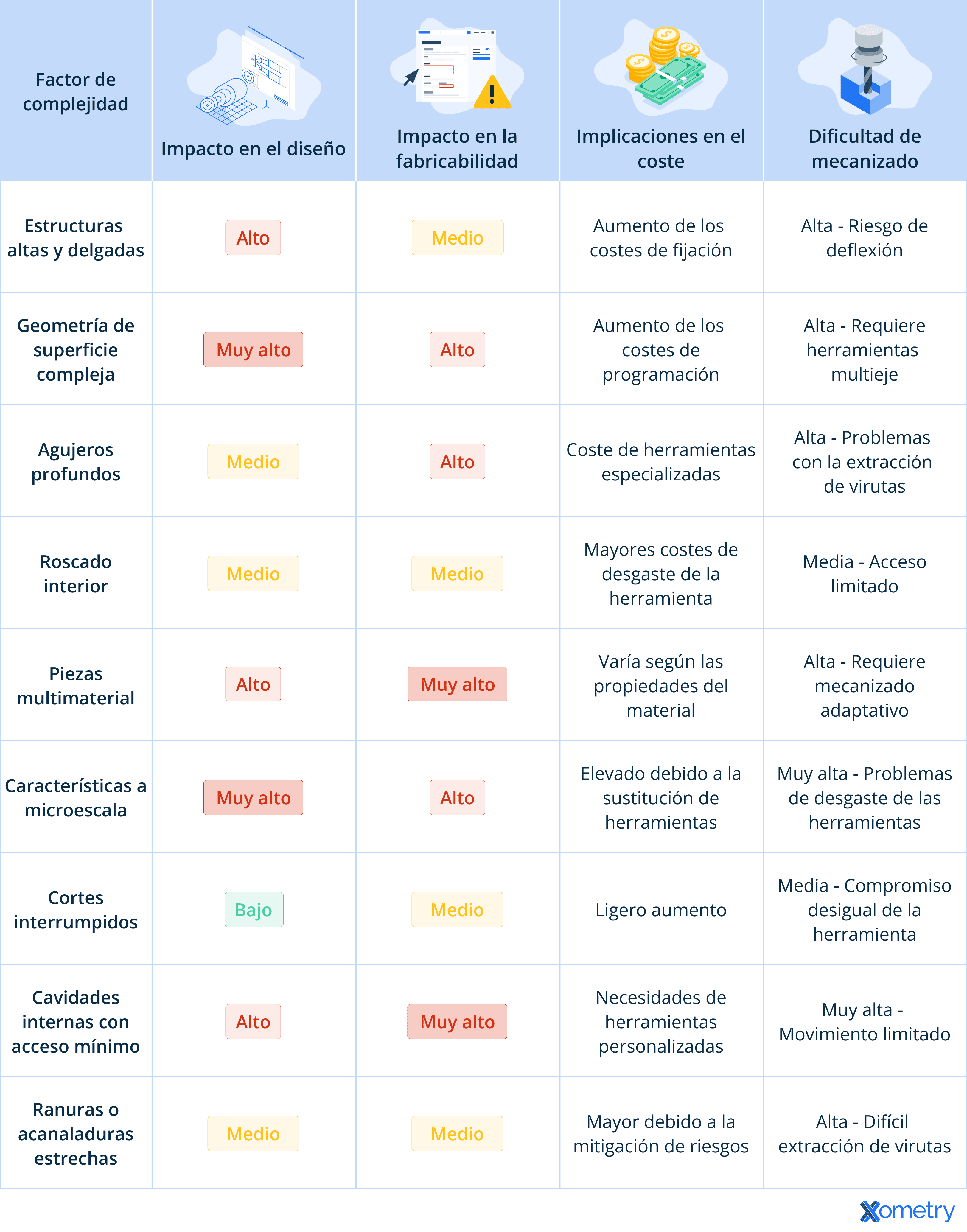 Las piezas mecanizadas CNC complejas presentan geometrías intrincadas, tolerancias estrechas, composiciones multimaterial y, en ocasiones, tamaños grandes, por lo que a menudo exigen mecanizado multieje y procesos avanzados. La siguiente tabla ofrece una visión general de los principales factores de complejidad en el mecanizado CNC, destacando su impacto en el diseño, la fabricabilidad, los costes y la dificultad general del mecanizado.