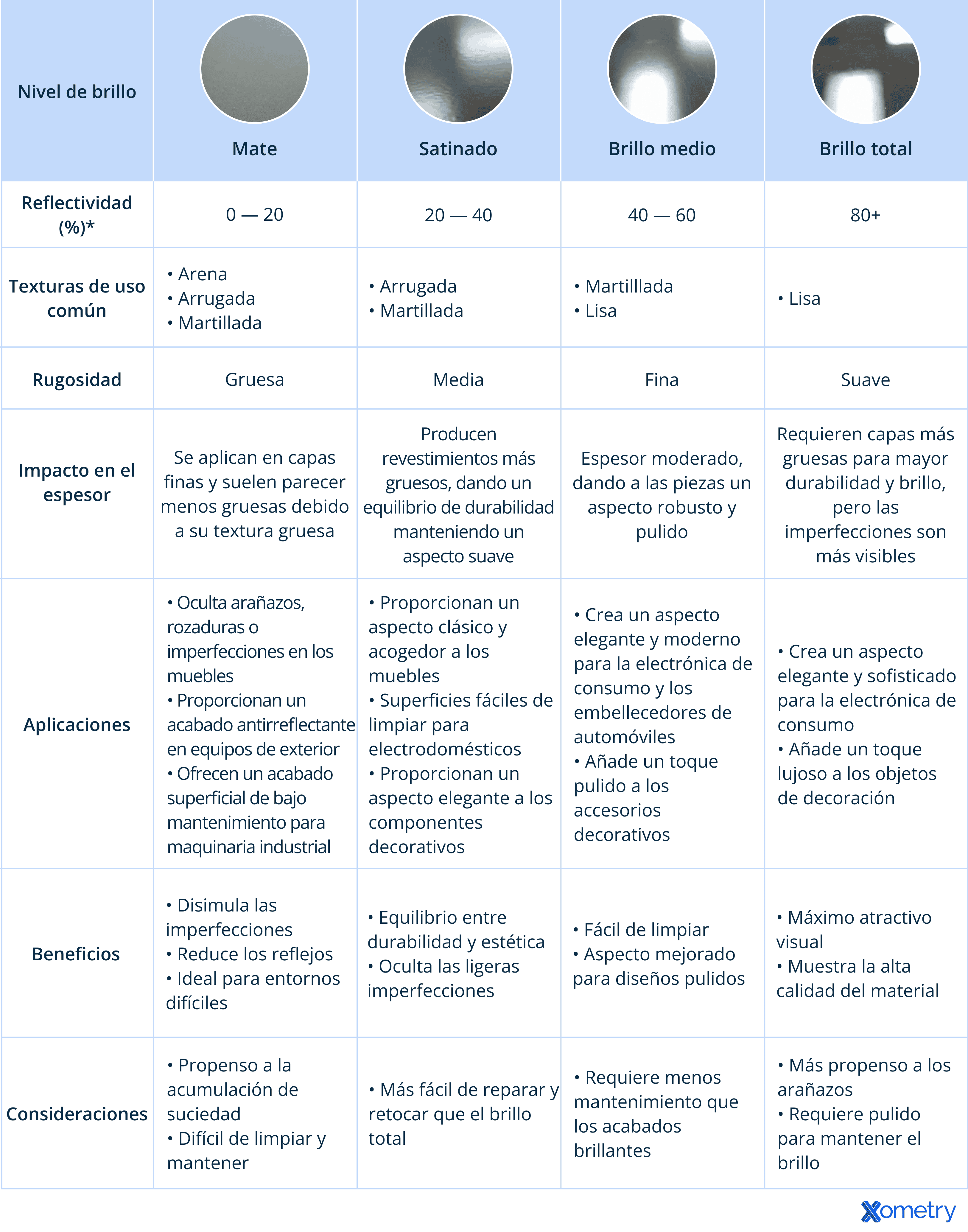 Desde el aspecto rugoso y de baja reflectividad de los acabados mate hasta el elegante aspecto de espejo del brillo total, cada nivel ofrece ventajas únicas en función de la aplicación. La siguiente tabla desglosa todo lo que necesita saber sobre los niveles de brillo, incluida su reflectividad, texturas y cómo afectan al grosor y rendimiento del recubrimiento, para que pueda elegir con confianza el acabado adecuado para su proyecto.