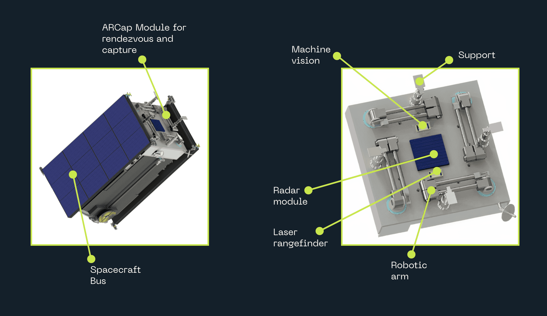 Este sistema se integra perfectamente en diversas naves espaciales, lo que garantiza una amplia gama de aplicaciones. La capacidad de manejar objetivos no cooperativos lo convierte en un sistema revolucionario, que puede ayudar a repostar las futuras estaciones espaciales comerciales y a eliminar la basura espacial. ARCap mitiga la costosa y derrochadora práctica de desechar satélites y ofrece soluciones prácticas para el repostaje de estaciones espaciales en la era post-ISS.