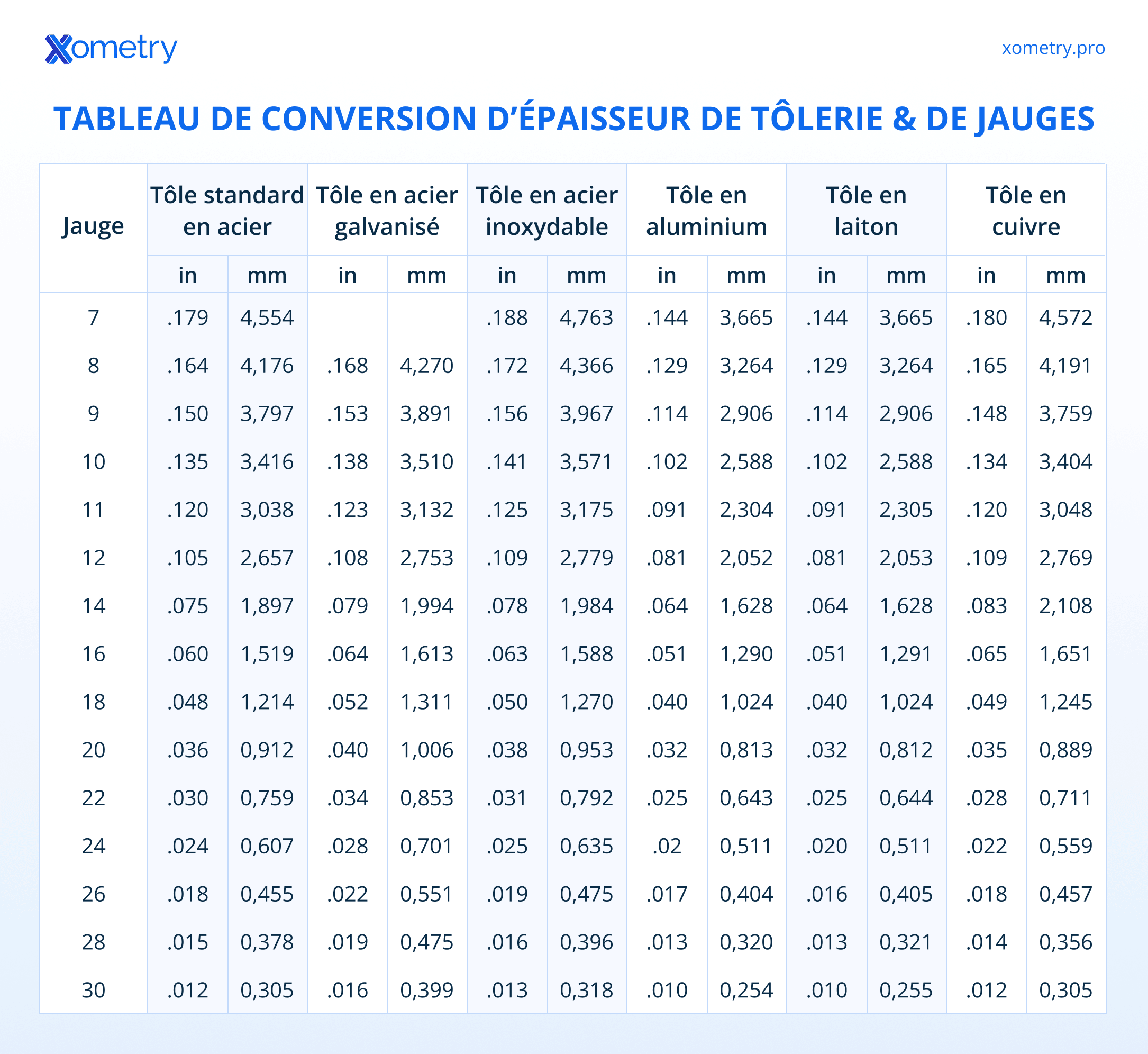 Pour faciliter le travail des ingénieurs et des designers, nous avons compilé toutes les conversions de jauges dans un tableau de référence unique téléchargeable.
