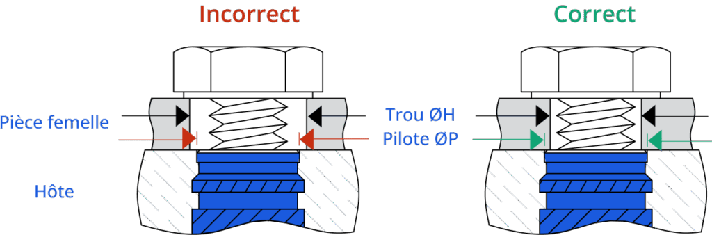 Le diamètre du trou de dégagement dans la pièce femelle est également important. C’est l’insert, et non le plastique, qui doit supporter la charge. Le trou dans la pièce femelle doit être plus grand que le diamètre extérieur de la vis d’assemblage, mais plus petit que le diamètre de guidage ou de la face de l’insert. Cela empêche l’arrachement de l’insert.