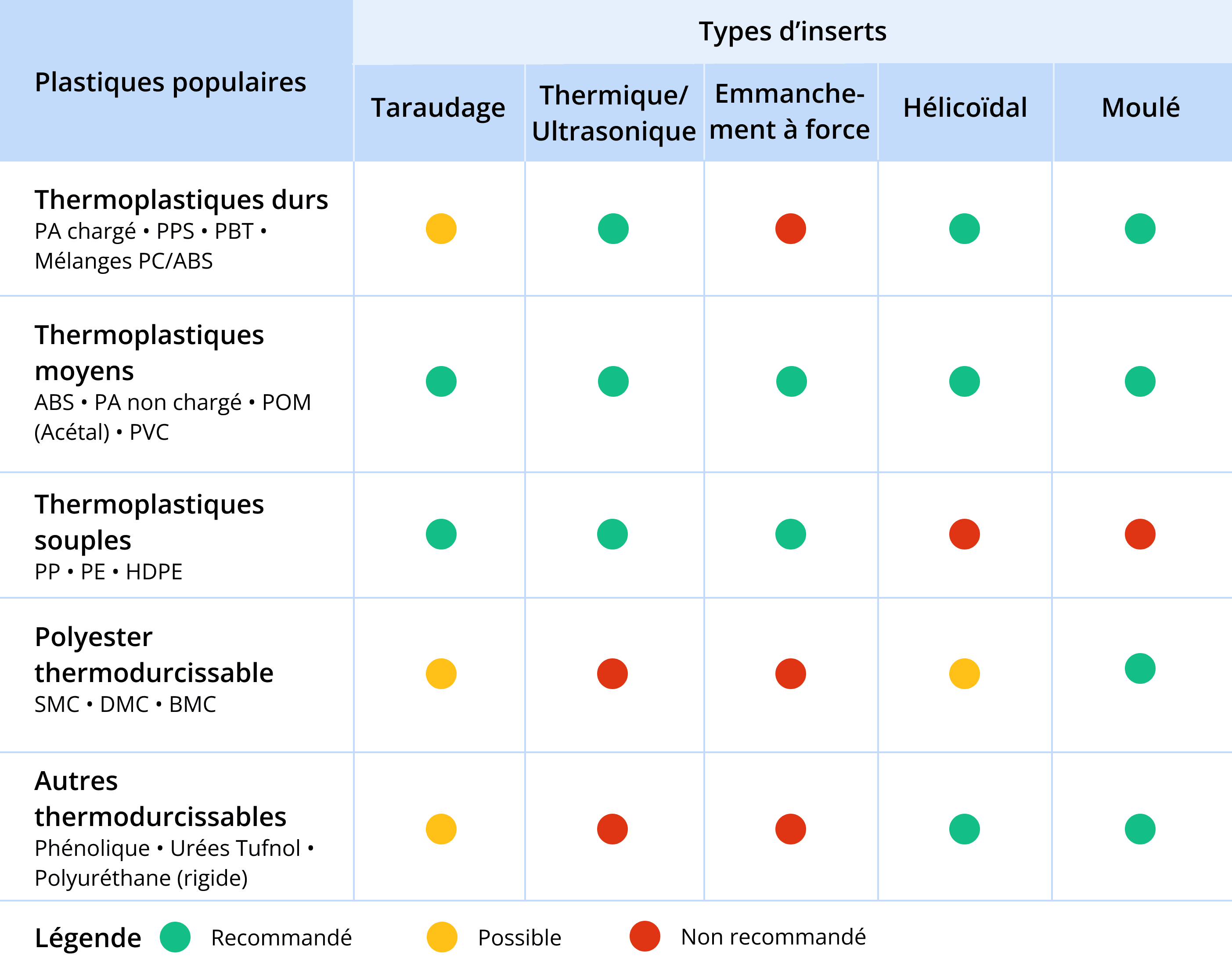 Utilisez le tableau ci-dessous comme référence, mais assurez-vous de vérifier auprès de votre fabricant préféré le meilleur plastique à utiliser pour une série d’inserts spécifique. De plus, il est conseillé de déterminer la résistance au cisaillement de votre matériau pour savoir s’il peut supporter le couple ou la résistance à l’arrachement de votre application.