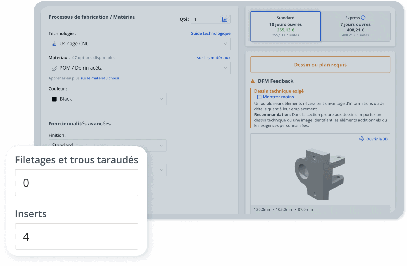Que vous ayez besoin de composants fabriqués par Usinage CNC, Impression 3D, ou Mmulage par injection, notre plateforme propose un devis instantané et manuel pour une sélection de thermoplastiques et de plastiques thermodurcissables.
