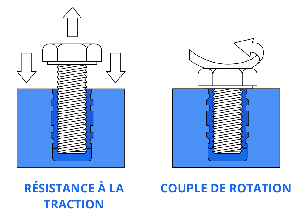 Les principaux facteurs de résistance des inserts sont leur résistance à l’arrachement de la pièce (force d’arrachement) et à la torsion à l’intérieur de la pièce lorsque la fixation correspondante est serrée (force de couple). Un insert plus long augmente la résistance à l’arrachement, tandis qu’un insert de plus grand diamètre améliore la capacité de couple.