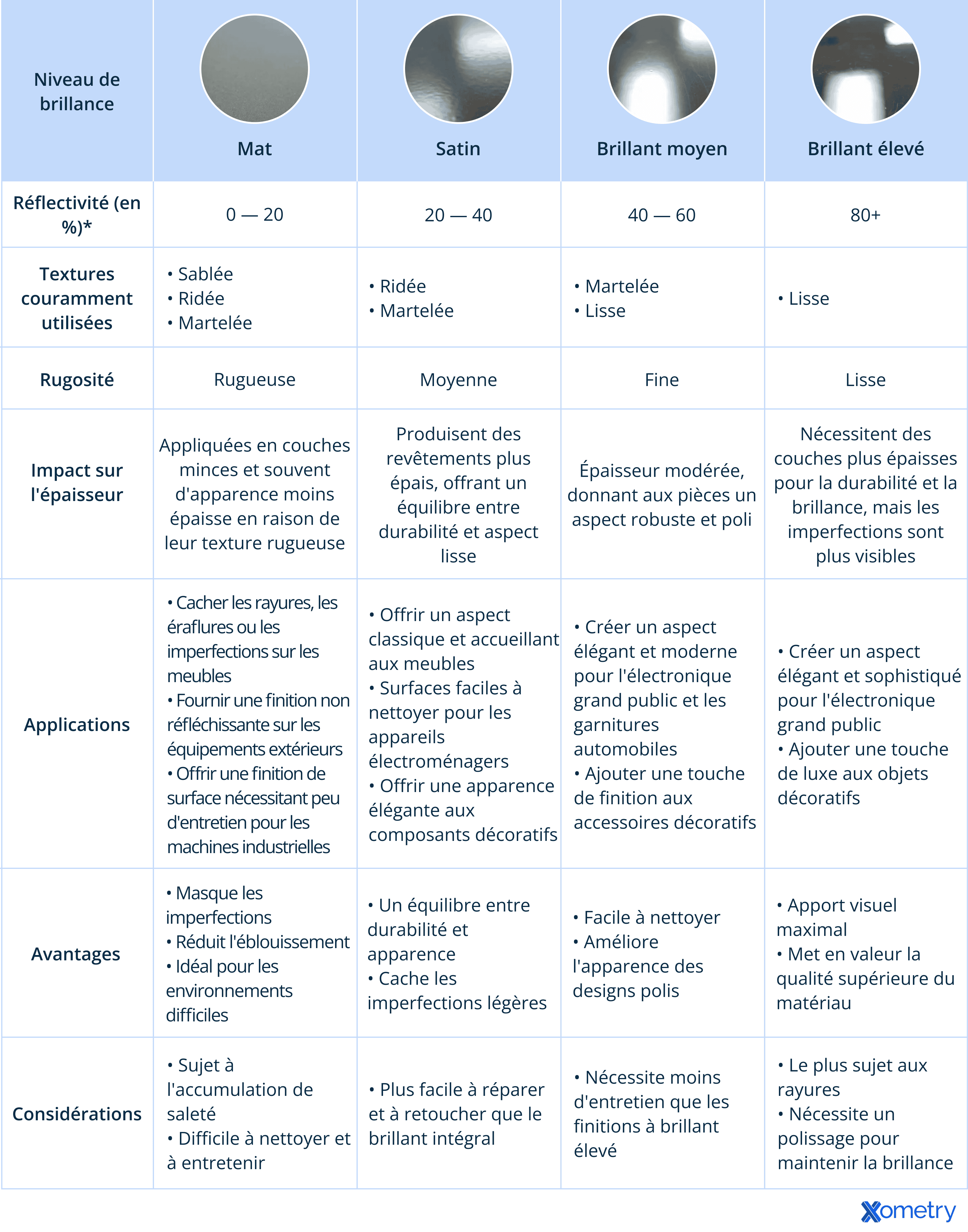 De l’aspect robuste et peu réfléchissant des finitions mates au charme élégant de type miroir des finitions brillantes, chaque niveau présente des avantages uniques en fonction de l’application. Le tableau ci-dessous détaille tout ce que vous devez savoir sur les niveaux de brillance, y compris leur réflectivité, leurs textures et leur impact sur l’épaisseur et les performances du revêtement, afin que vous puissiez choisir en toute confiance la finition la mieux adaptée à votre projet.